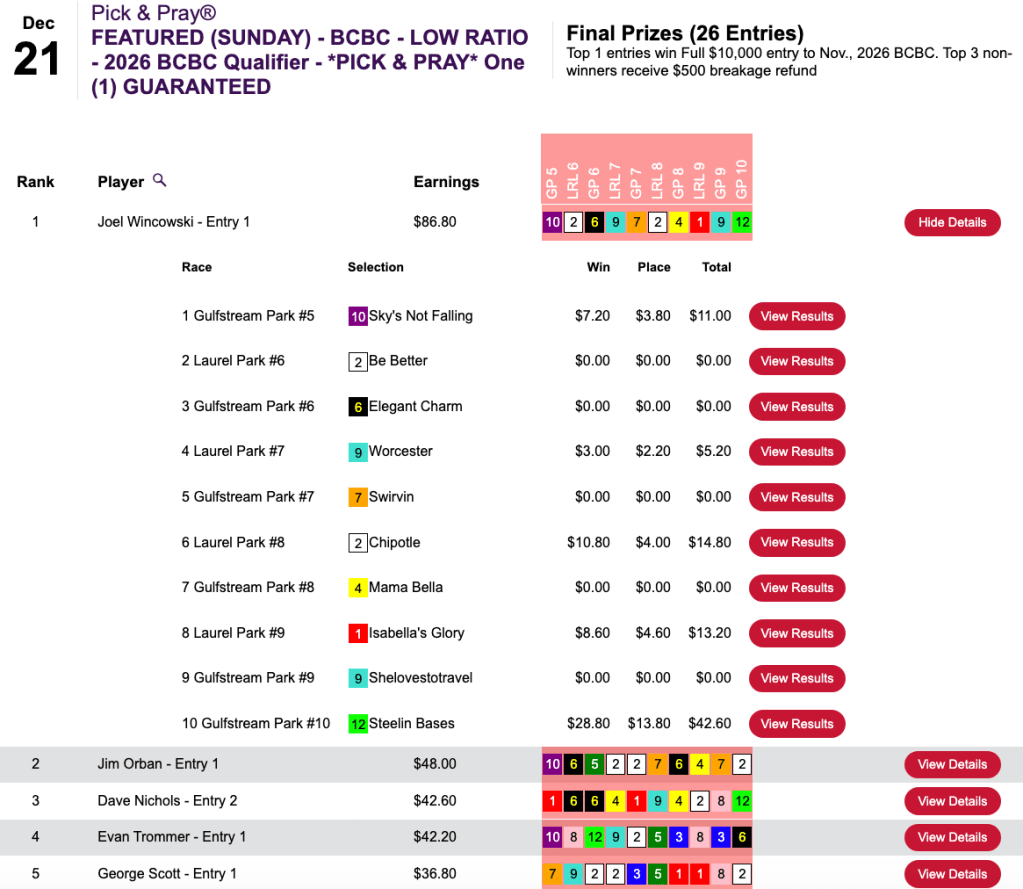Yancovitch (6 wins, 1 place) took home the $10,000 seat following play in Saturday’s $179 Breeders’ Cup Betting Challenge qualifier at HorsePlayers.