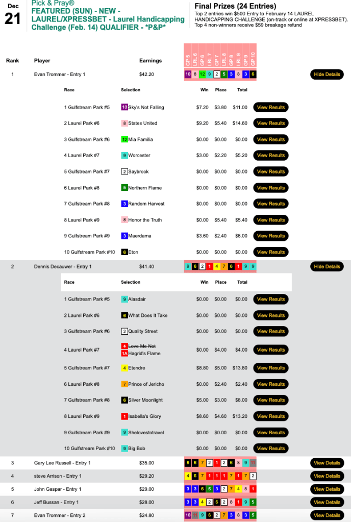 His 4 wins and 1 place resulted in a first-place performance in our first qualifier to the February 14 Laurel Handicapping Challenge. In what was a tight, defensive-minded struggle, NHC Hall of Famer Dennis Decauwer (3W, 2P) finished second, and he, too, received a $500 entry. Trommer’s most lucrative piek was States United in race 6 at, appropriately enough, Laurel. Decauwer’s heavy lifter was Etendre ($8.80, $5.00) in the 7th at Gulfstream.