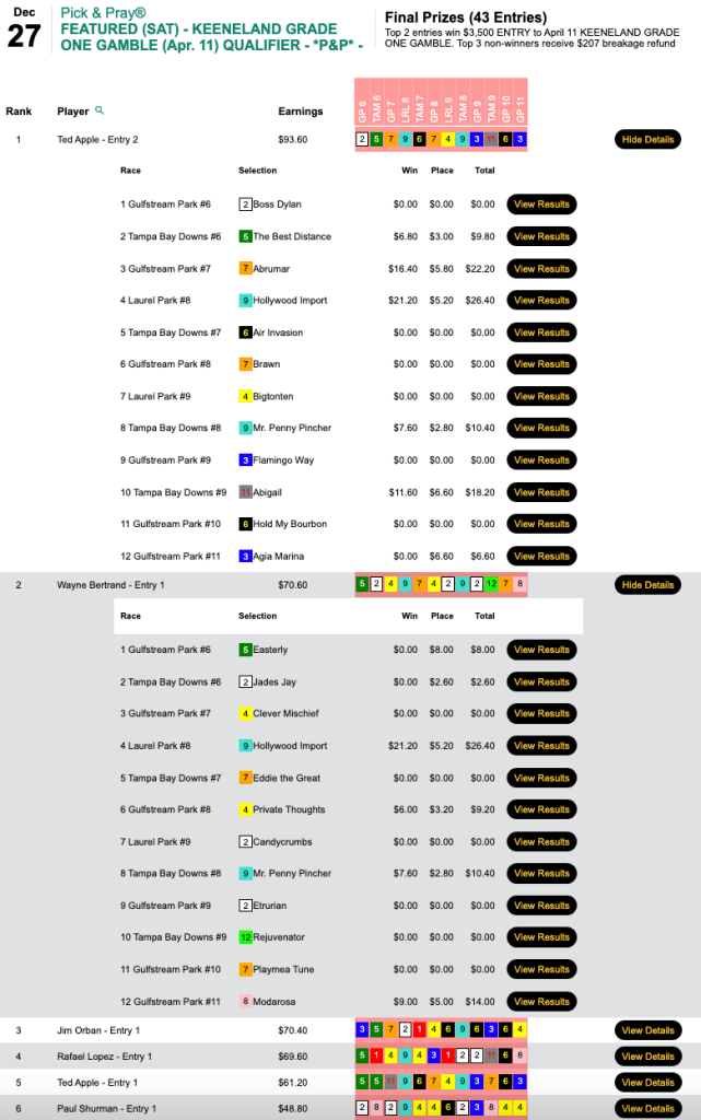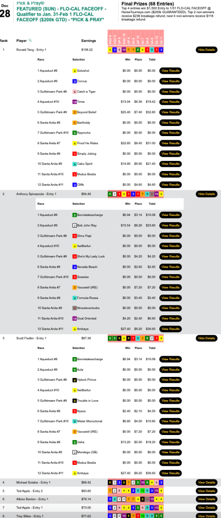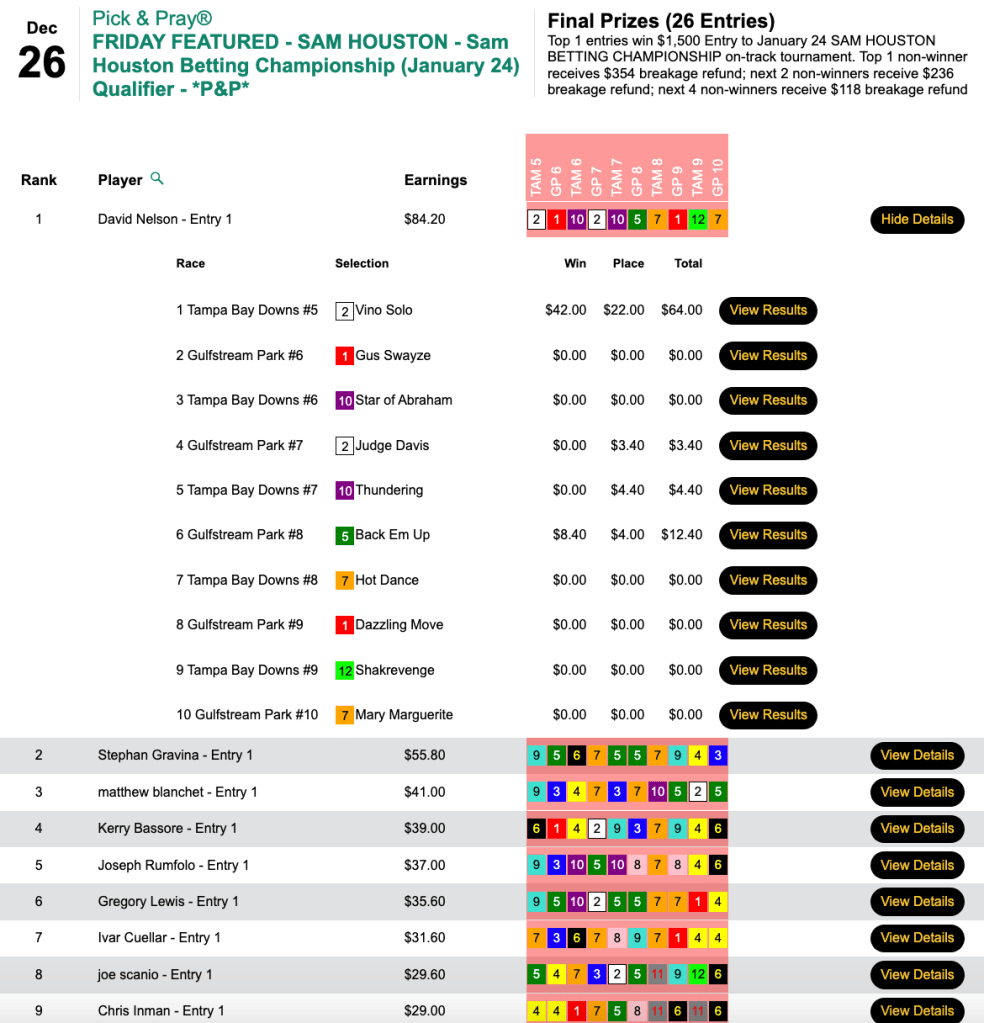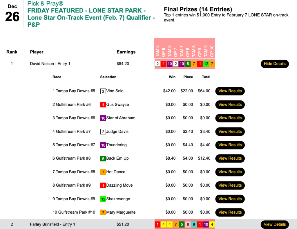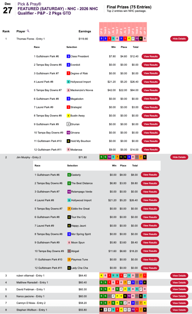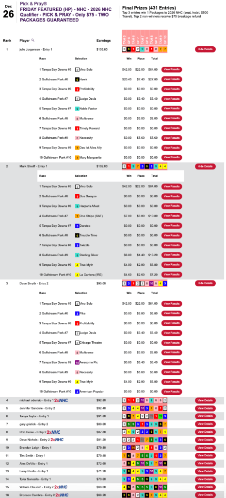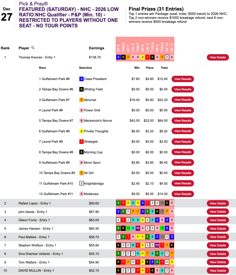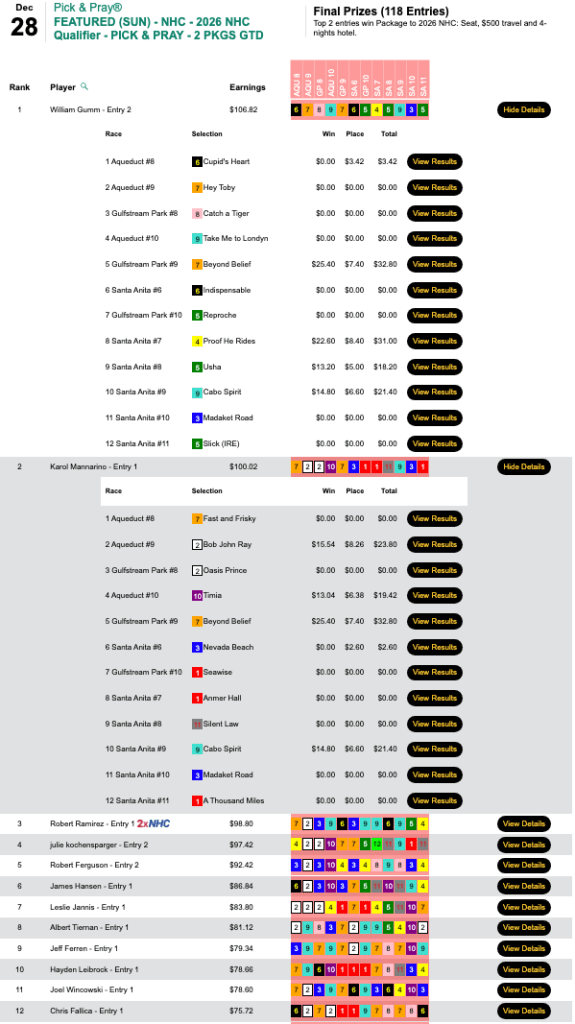 They got the seats in Sunday’s $165 NHC Pick & Pray here at HorseTourneys.