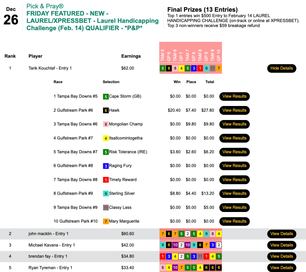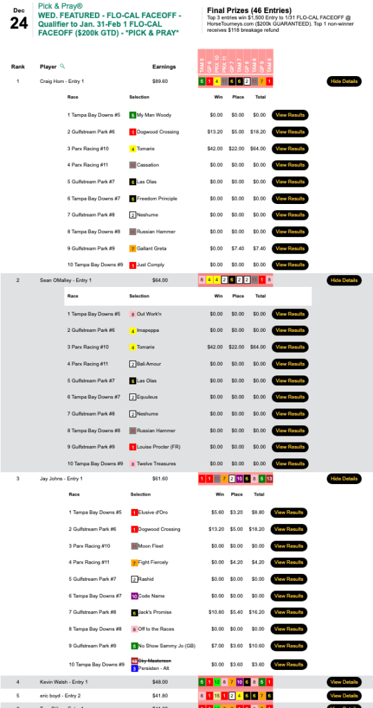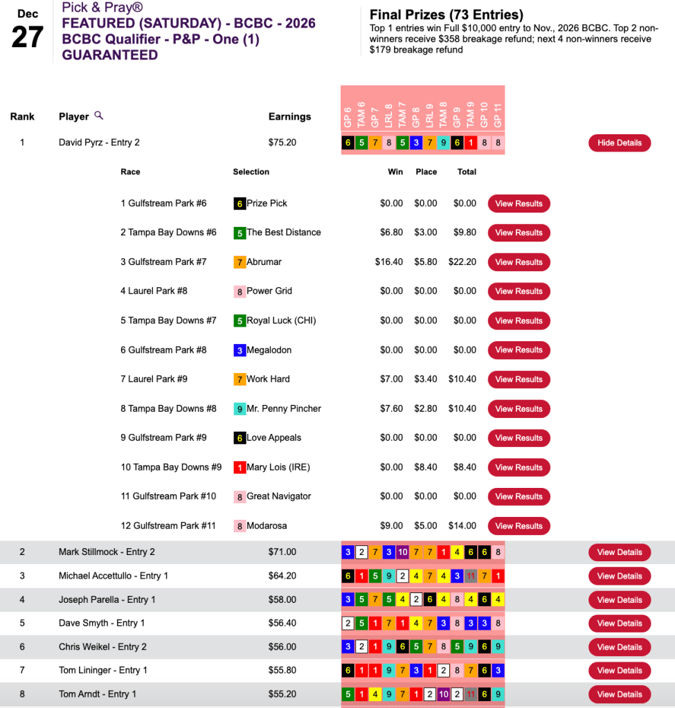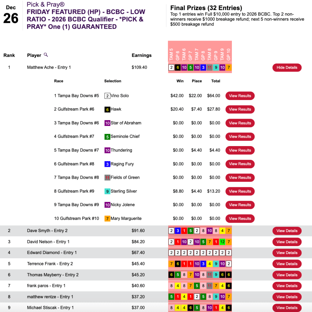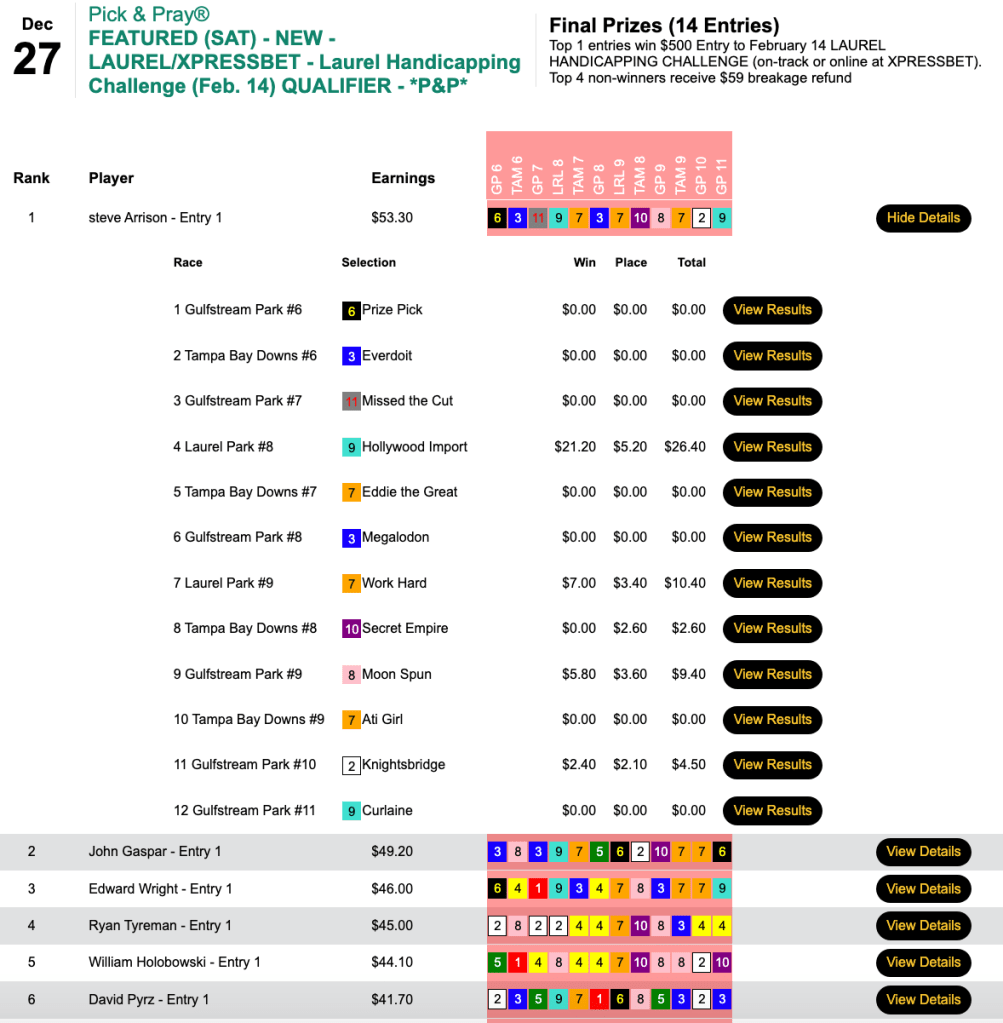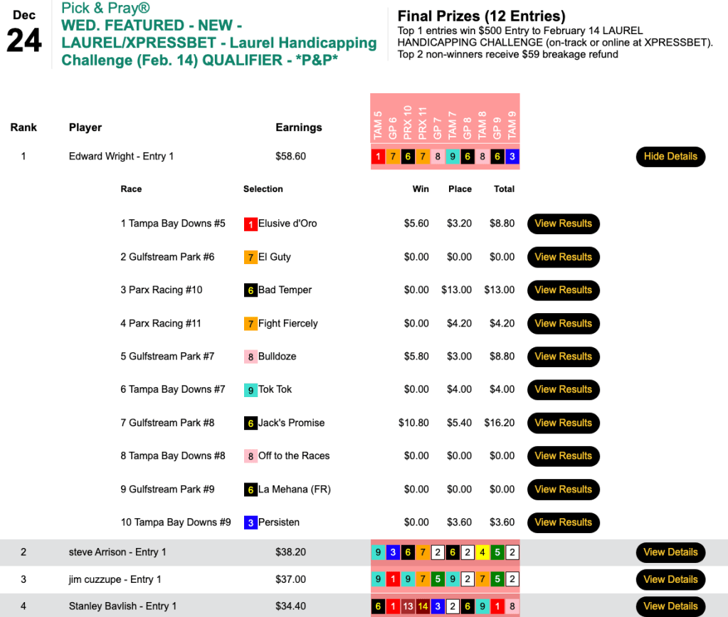They got the seats in Sunday’s $165 NHC Pick & Pray here at HorseTourneys.
