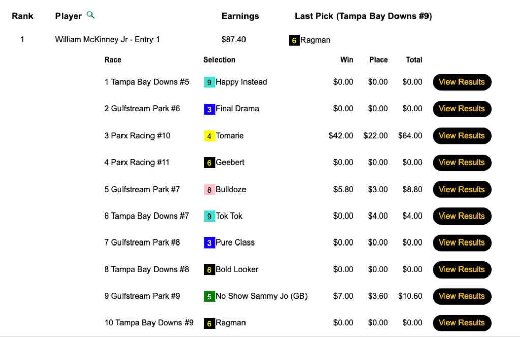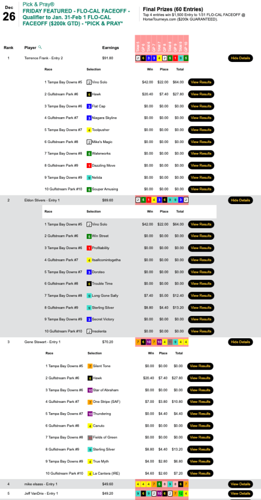 The same selections, which included bomb Vino Solo ($122.40, $40.00) in race 5 at Tampa Bay Downs, also brought Stivers a triumph worth $9,921 in Friday’s HT Tour battle, our $15,000 Gtd. Pick & Pray, which closed with a final purse of $22,048.