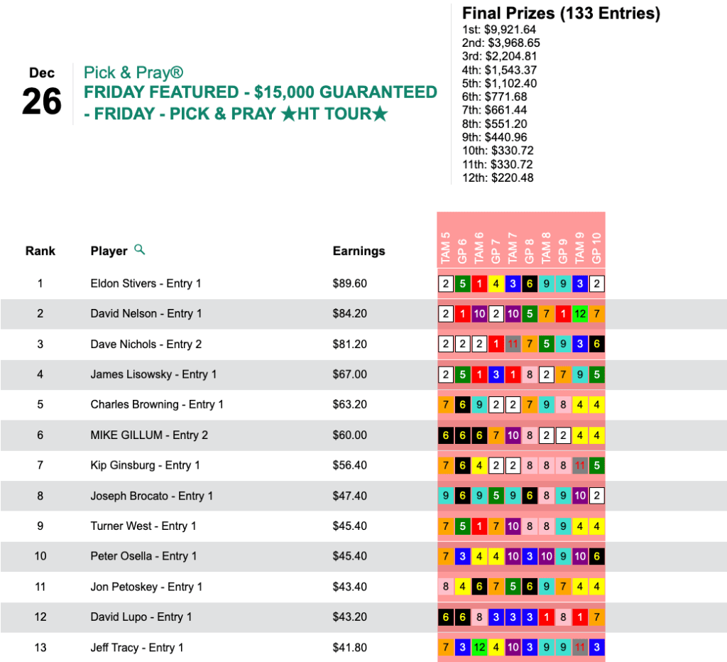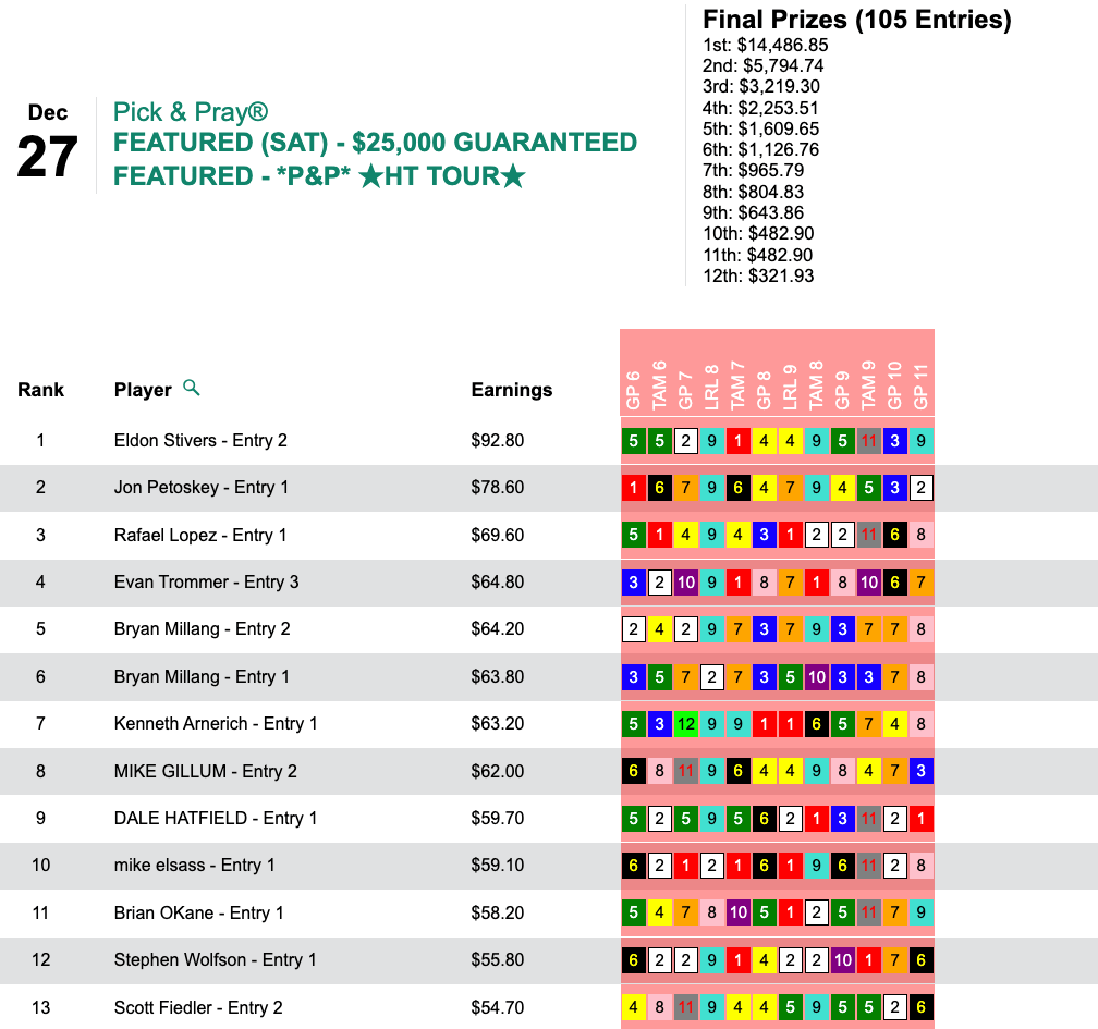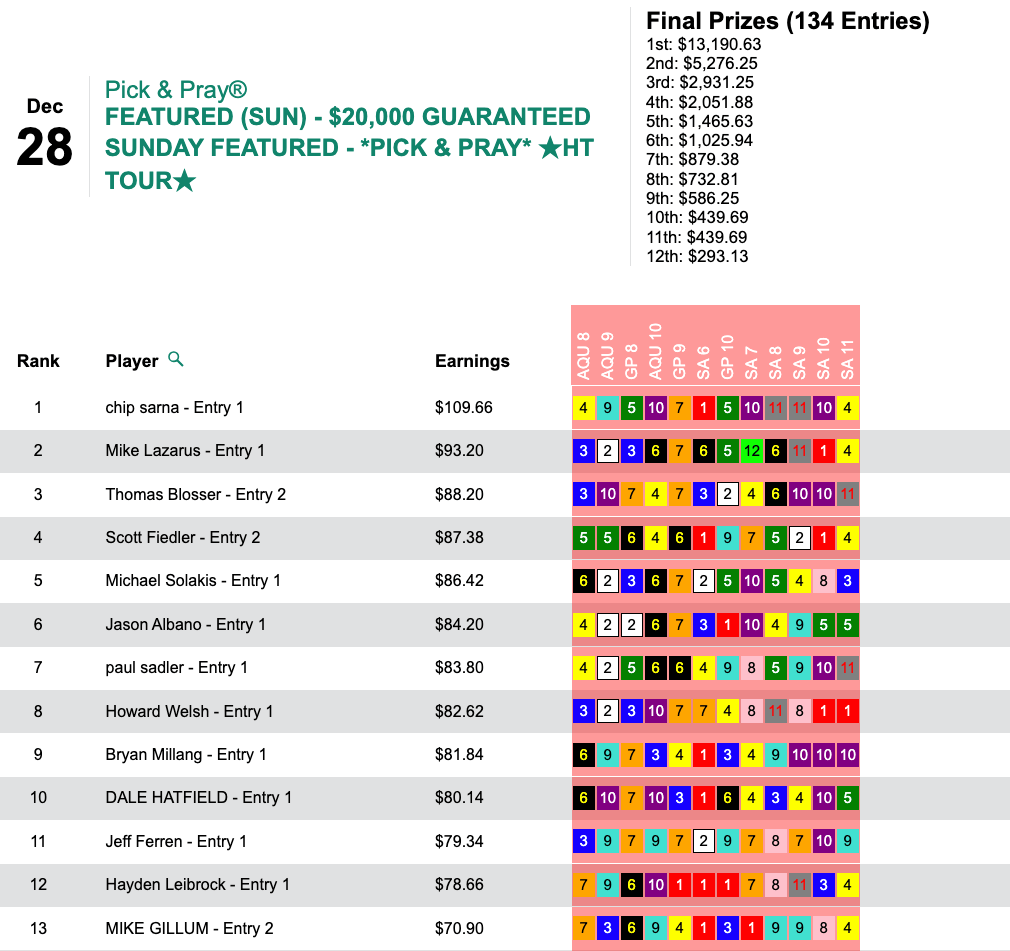 Sarna pocketed $13,190 for capturing Sunday’s HT Tour event, our $20,000 Gtd. Pick & Pray, which closed its doors with $29,312 in the kitty.