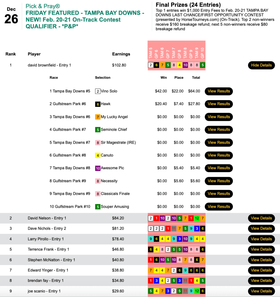 Brownfield (2 firsts, 2 seconds) earned the $1,000 berth in Friday’s qualifier to the High Rollers Handicapping Contest, to be hosted by Tampa Bay Downs on February 20-21.