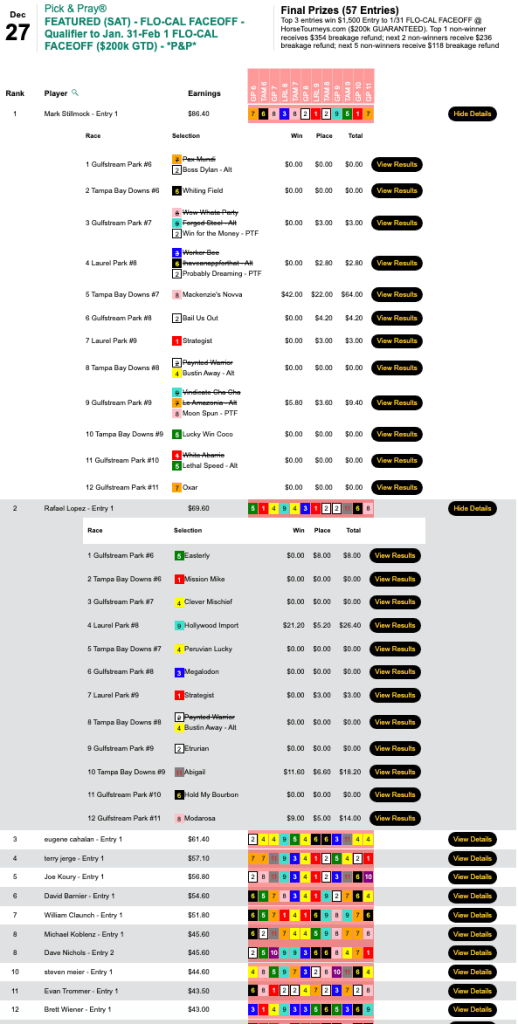 Stillmock (2 wins, 4 places) headed the leaderboard in Saturday’s Flo-Cal Faceoff qualifier. The other two available Flo-Cal entries went to Rafael Lopez (which may have helped take some of the sting out of the Pegasus qualifier for him) and Gene Cahalan. Neither Lopez nor Cahalan came up with Mackenzie’s Novva, but they each had Hollywood Import.