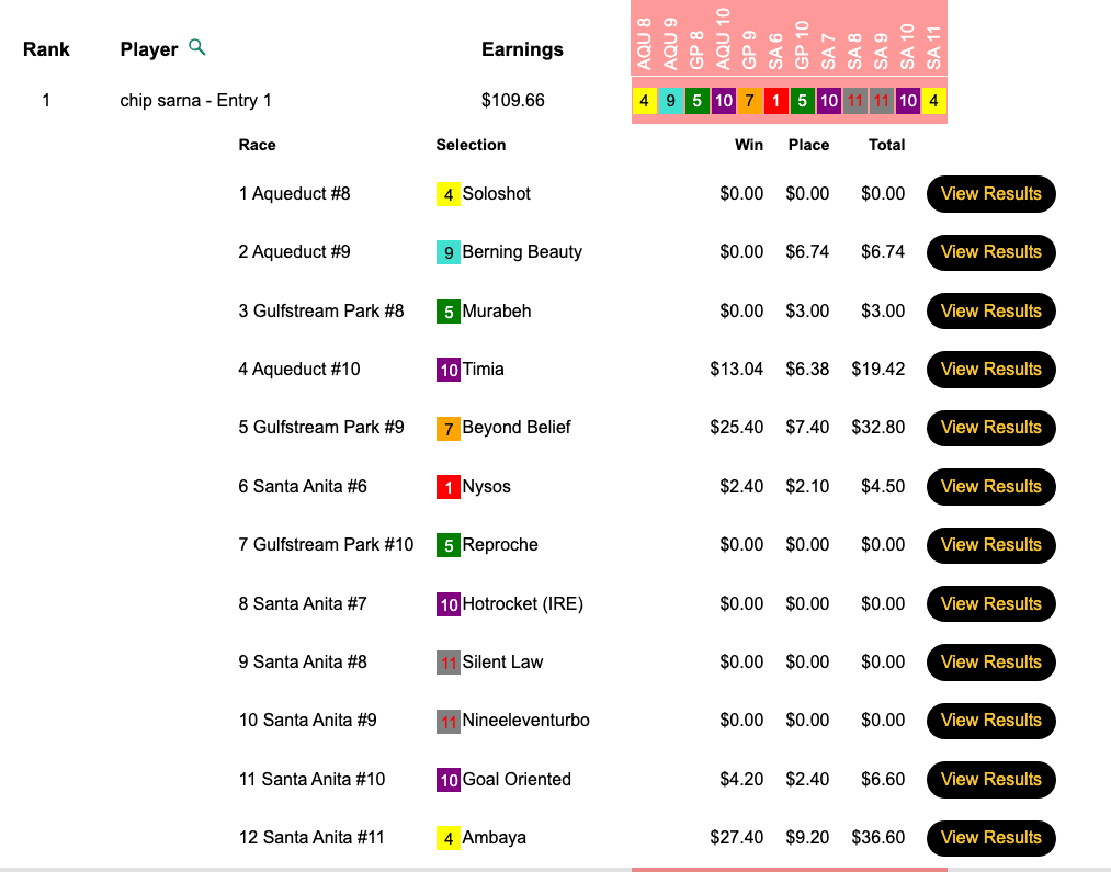 On Saturday, Stivers stockpiled 5 winners and 4 runners up, topped by Hollywood Import ($21.20, $5.20) in race 8 at Laurel. The nine collections meant a second HT Tour victory in as many days—this one worth $14,486 in our richest tourney of the week, Saturday’s $25,000 Gtd. Pick & Pray, which wound up with a pot of $32,192.