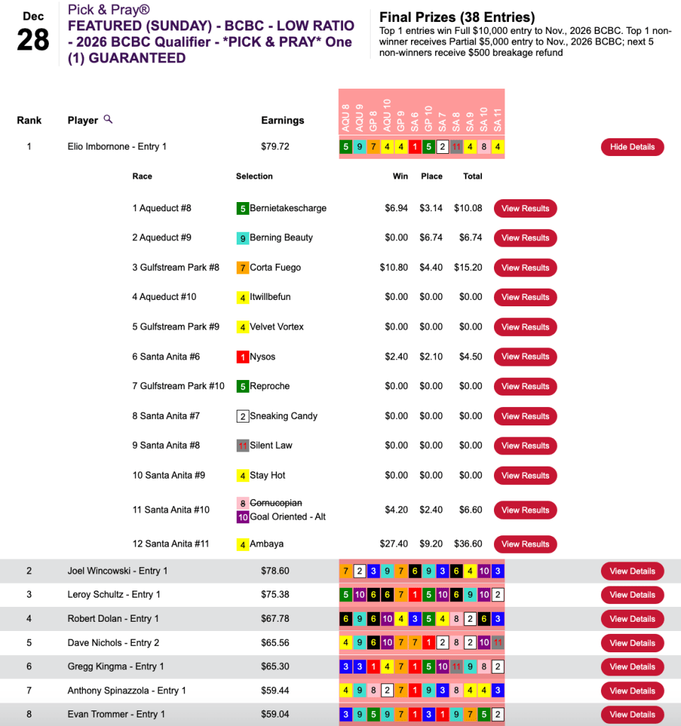 Imbornone emerged with the $10,000 seat at the conclusion of Sunday’s Breeders’ Cup Betting Challenge Low Ratio qualifier at HorsePlayers.