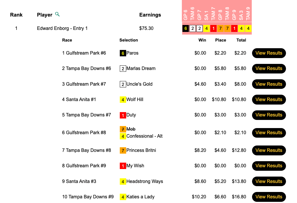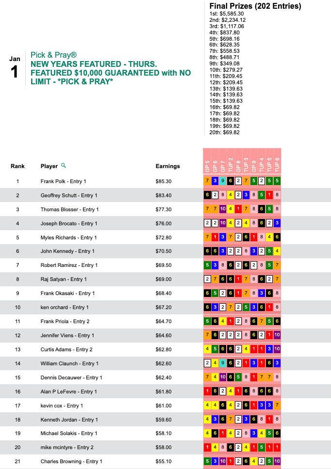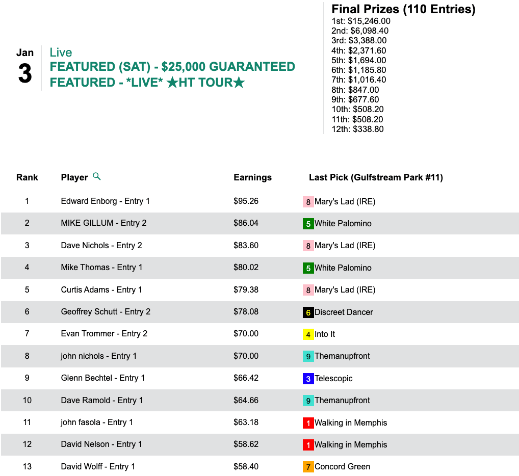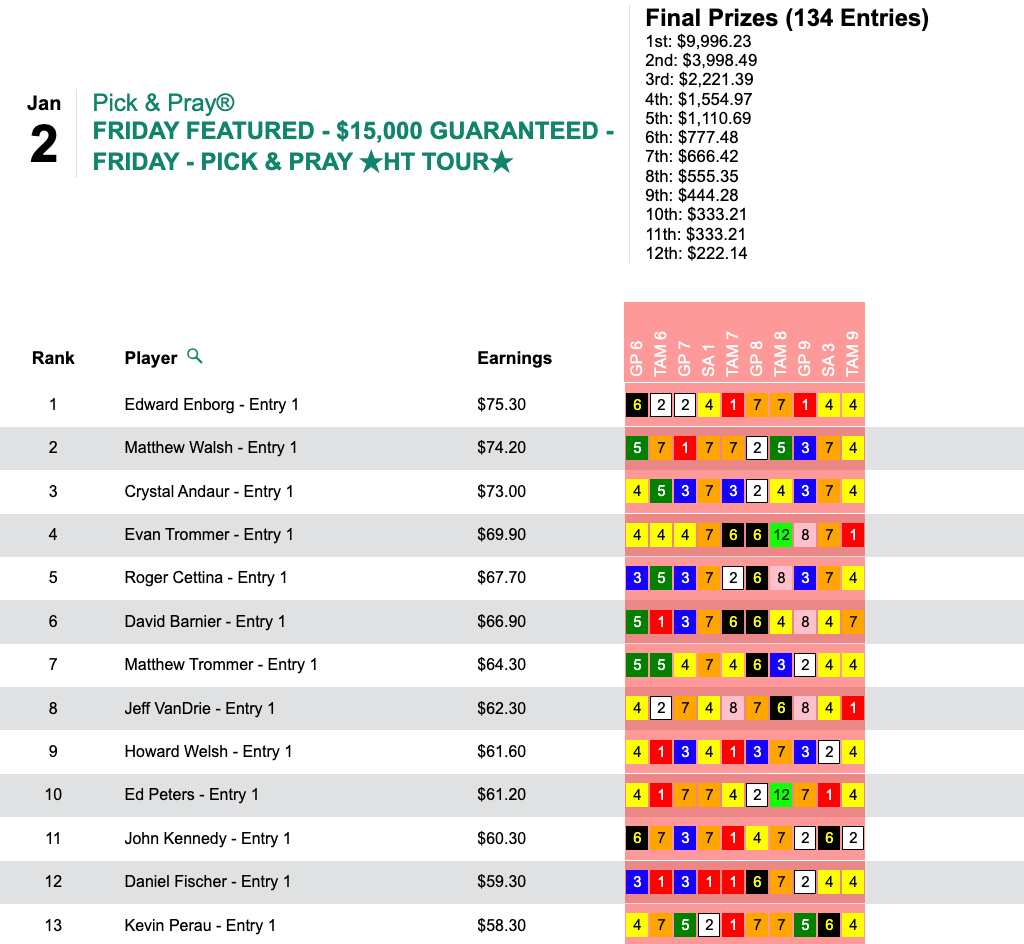 On Friday, Enborg racked up 4 firsts and 5 seconds from just 10 contest races to collect $9,996 in our first HT Tour event of the new year, our $15,000 Gtd. Pick & Pray, which ultimately paid out a total of $22,213.