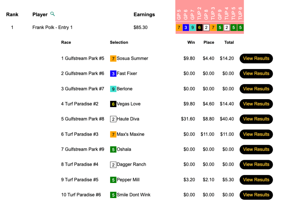 Sunday’s highest scorer was Bob Gianquitti, who amassed $119.64 on 4 wins and 4 places.