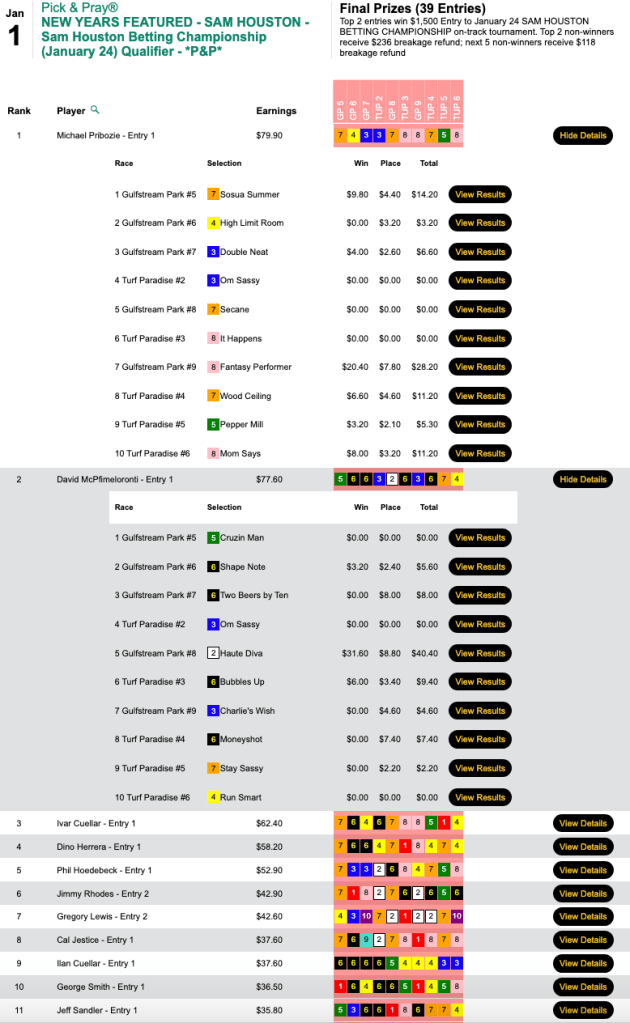 Pribozie swept the final four races to finish with 6 wins and 1 place on the day. He led the field in Thursday’s Houston Betting Championship qualifier—which also saw David McPfimeloronti (3W, 4P) secure a $1,500 berth for finishing second (thanks in no small part to Haute Diva).