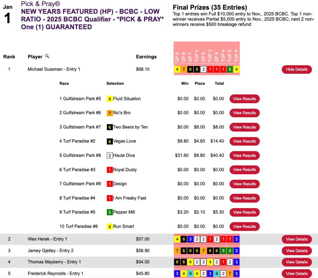 Sussman exited with the $10,000 seat at the conclusion of Thursday’s Breeders’ Cup Betting Challenge Low Ratio qualifier at HorsePlayers. Wes Herek received a $5,000 partial BCBC entry for reporting home in second position.