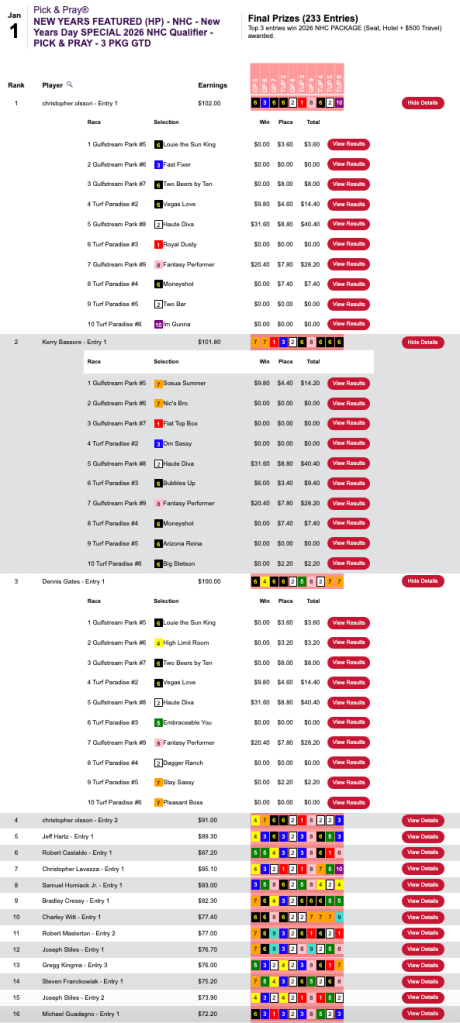 Olsson scored with Haute Diva ($31.60, $8.80) in the 8th at Gulfstream plus 2 other winners and 3 runners up to lead the way in Thursday’s special $125 NHC qualifier at HorsePlayers. Also punching their tickets to Vegas in this one were triple-digit scorers Kerry Bassore (3 wins, 3 places) and Dennis Gates (3W, 4P). Bassore and Gates also connected with Haute Diva.