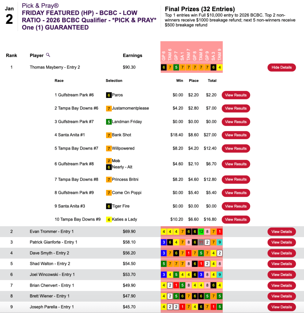Mayberry stockpiled 6 firsts and 2 seconds in taking the other Friday feature at HorsePlayers, a $500 Breeders’ Cup Betting Challenge Low Ratio qualifier.