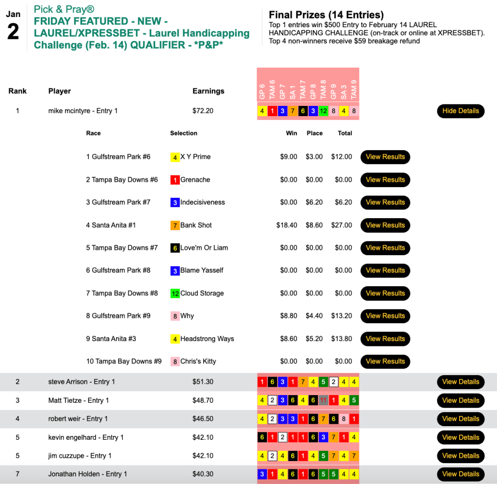 McIntyre earned a $500 entry in Friday’s qualifier to the February 14 Laurel Handicapping Challenge.