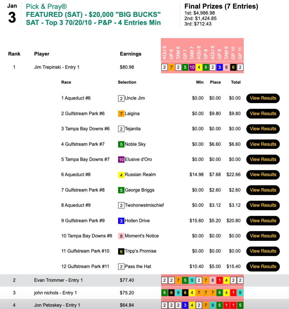 Final-contest-race winner Pass the Hat ($10.40, $5.00) boosted Jim Trepinski from 3rd to 1st in Saturday’s 7-player, $7,124 Big Bucks Pick & Pray.