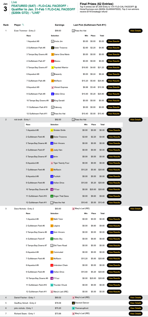 Trommer (5 wins, 2 places) had Paynted Warrior ($16.60, $4.60) fairly early on in the 7th at Tampa, but later he used Pass the Hat ($10.40, $5.00) at the end in the 11th at Gulfstream to jump from 4th-place to 1st.