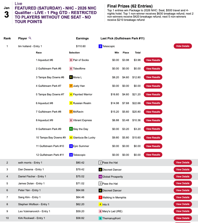 Holland took Saturday $210 NHC qualifier–a test restricted to those who had yet to nail down a 2026 seat. His most productive pick was Russian Realm ($14.98, $7.68) in race 8 at Aqueduct.
