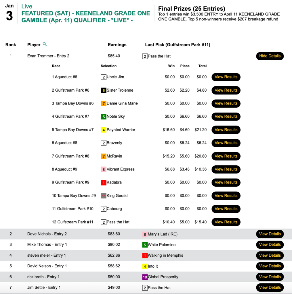 Craig Amundson (5 wins, 3 places) and Steven Lipinski (also 5W, 3P) each came away with $3,500 seats in Friday’s qualifier to the April 11 Keeneland Grade One Gamble.