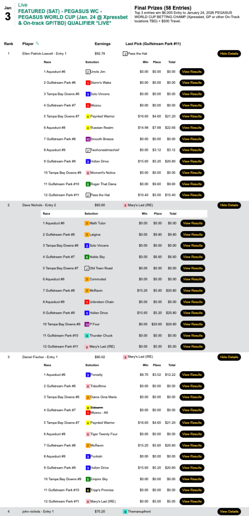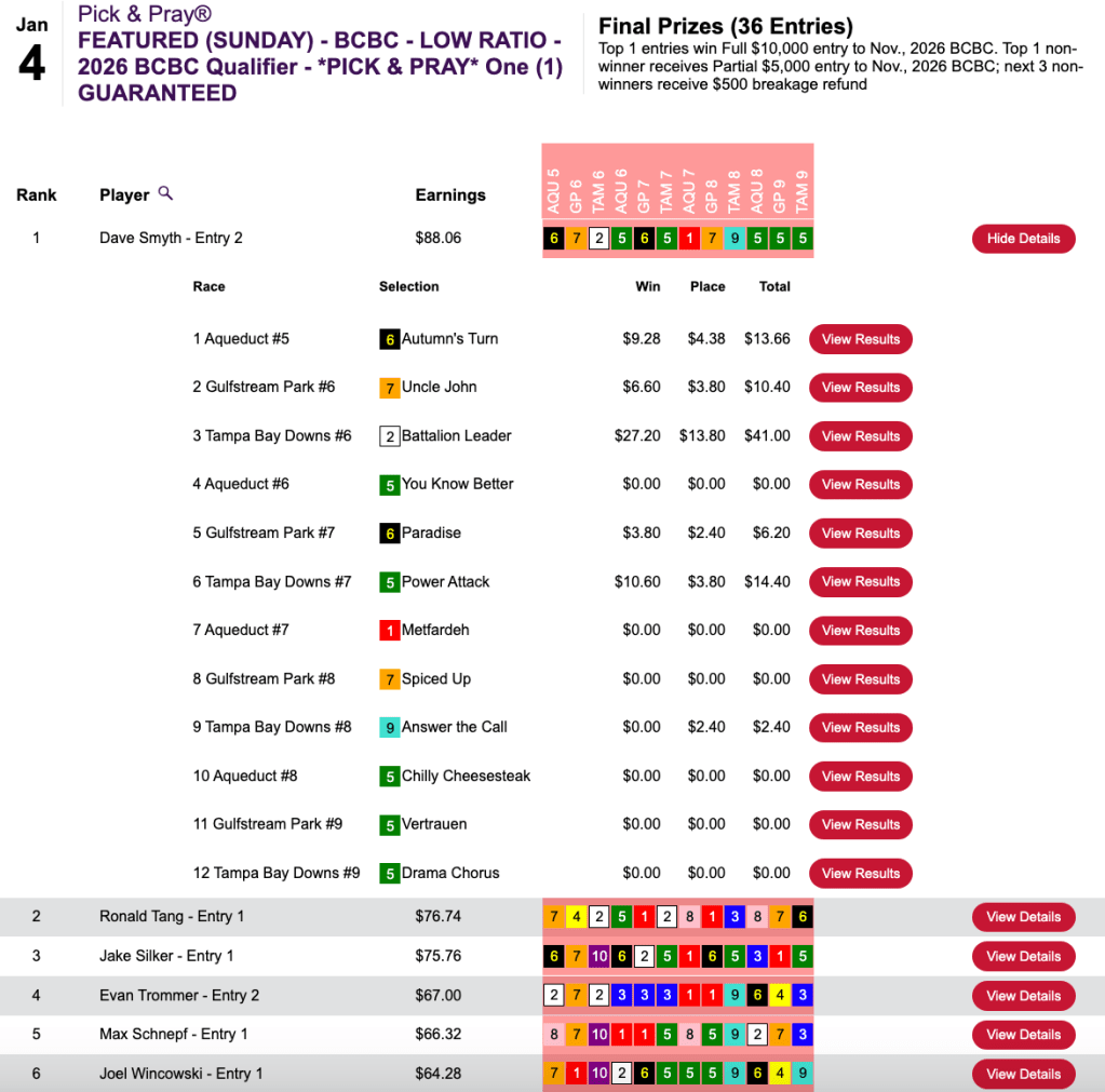 On the final Sunday of 2025, William “Bubble” Gumm won an NHC seat in a $165 Pick & Pray here at HorseTourneys. On the first Sunday of 2026, it was the same story.