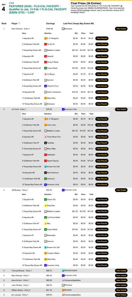 Using the same picks as in the Tampa play-in, Vail led a group of four Friday Flo-Cal seat winners. The other three were Evan Trommer (4 wins, 1 place), Matthew Trommer (4W, 1P) and Kevin Walsh (5W, 0P). The Trommers shared an appreciation of Bank Shot. In order to get up for fourth, Walsh needed to hit the “late double,” which included Katies a Lady ($10.20, $6.60) in the 9th at Tampa.