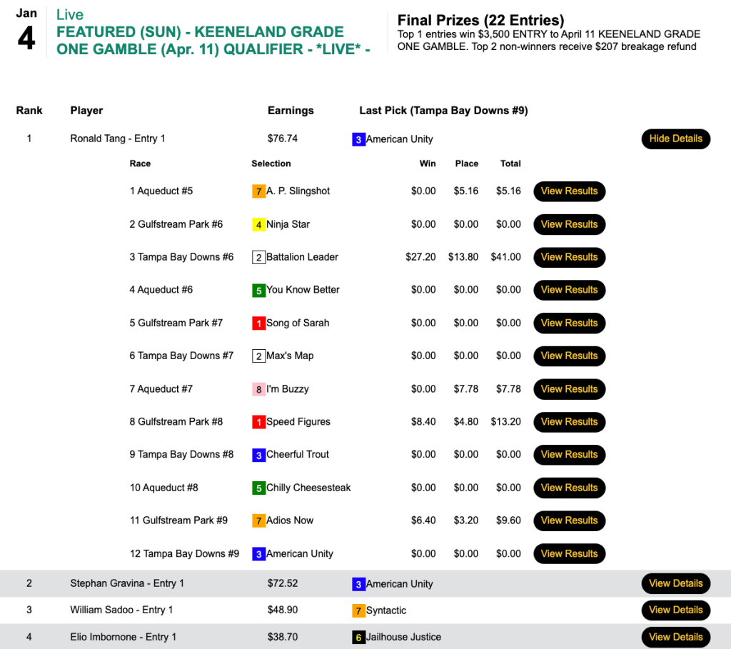 Tang recorded victories in two very nice Sunday qualifiers—one to the Pegasus World Cup Betting Championship and the other to the Keeneland Grade One Gamble.