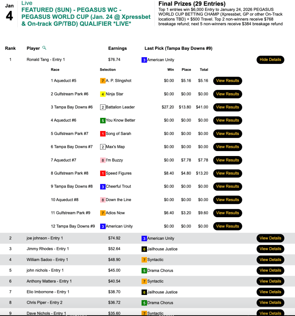 Tang got a $5,000 partial entry for topping all except $10,000 seat earner Dave “The Warrior” Smyth (5 firsts, 1 second). Smyth’s five winners (one of which was Battalion Leader) came over the first six tourney races—including one in each of the first three.