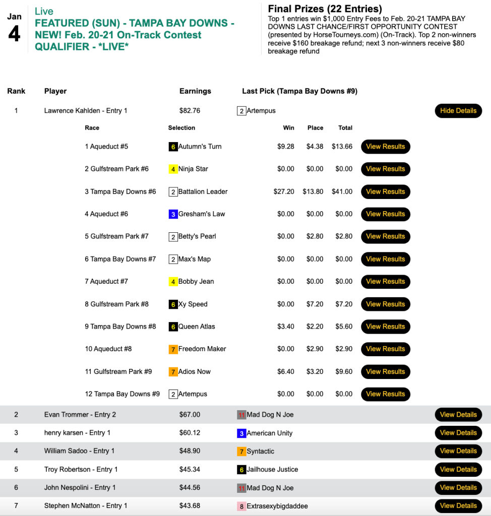 That’s because the same Hollen Drive-highlighted selections landed Nichols on top of the leaderboard in Saturday’s qualifier to the High Rollers Handicapping Contest at Tampa Bay Downs.