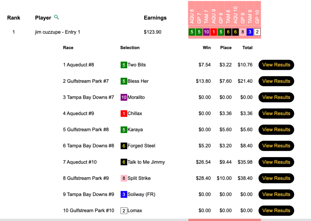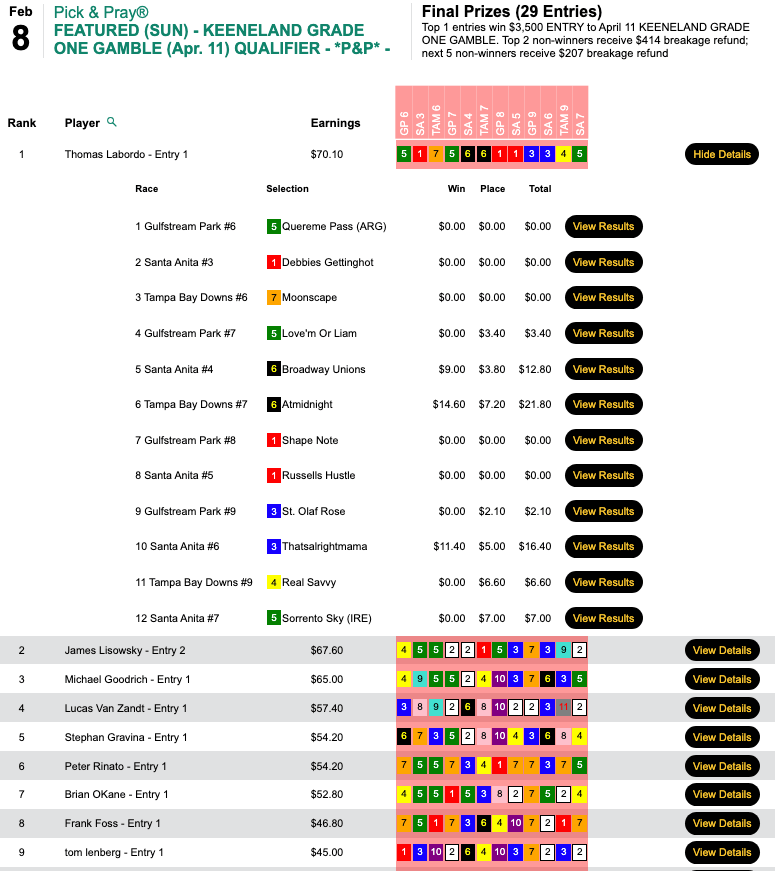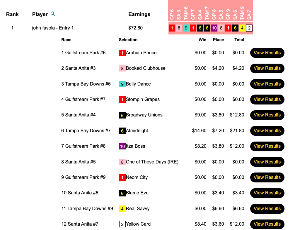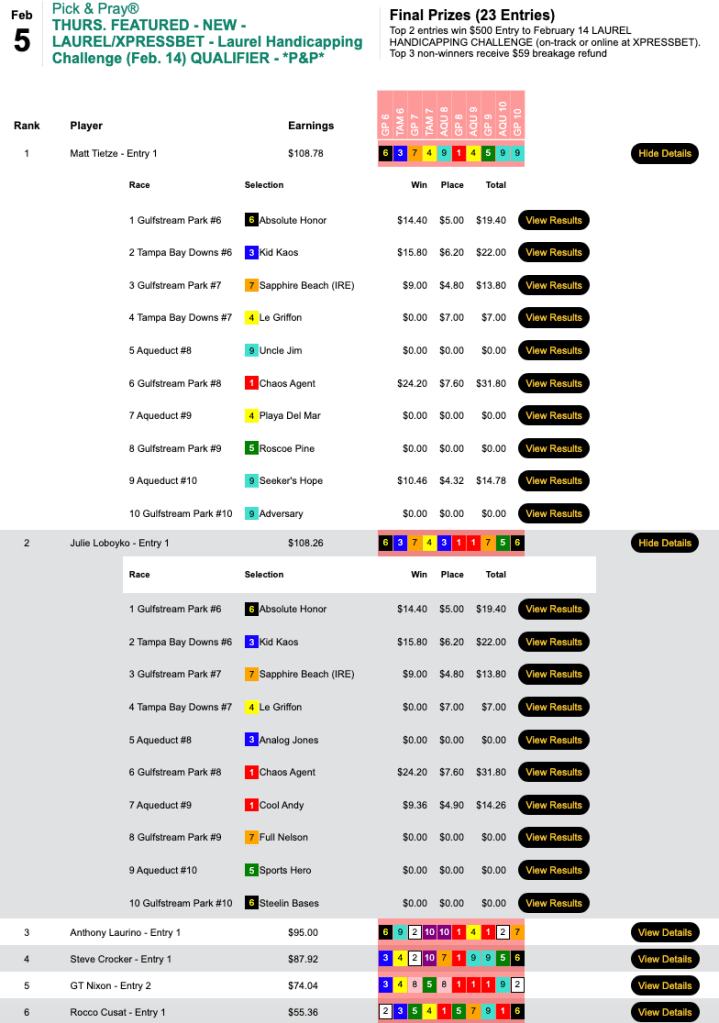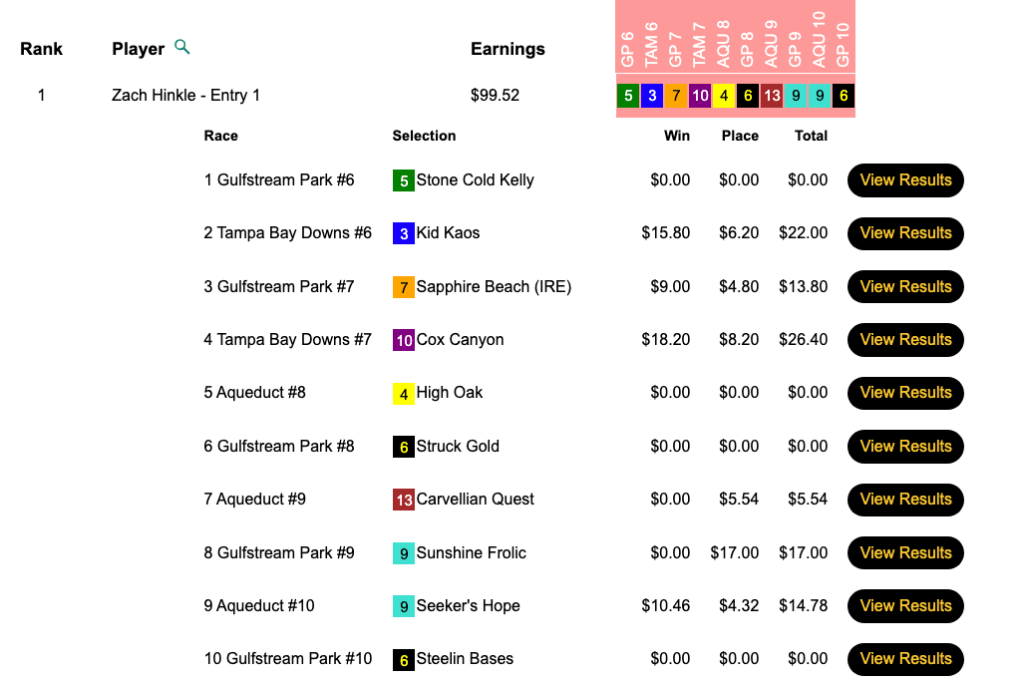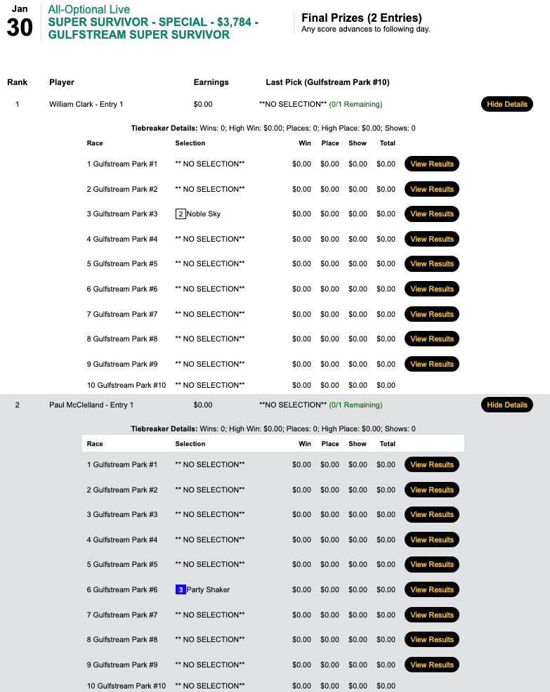 ALERT: The Gulfstream Championship meet is long enough for us to offer a second Gulfstream Super Survivor tourney this meet. We’ll call it GP Super Survivor II. That next one closes this Thursday, February 12.