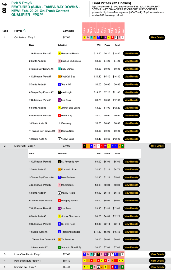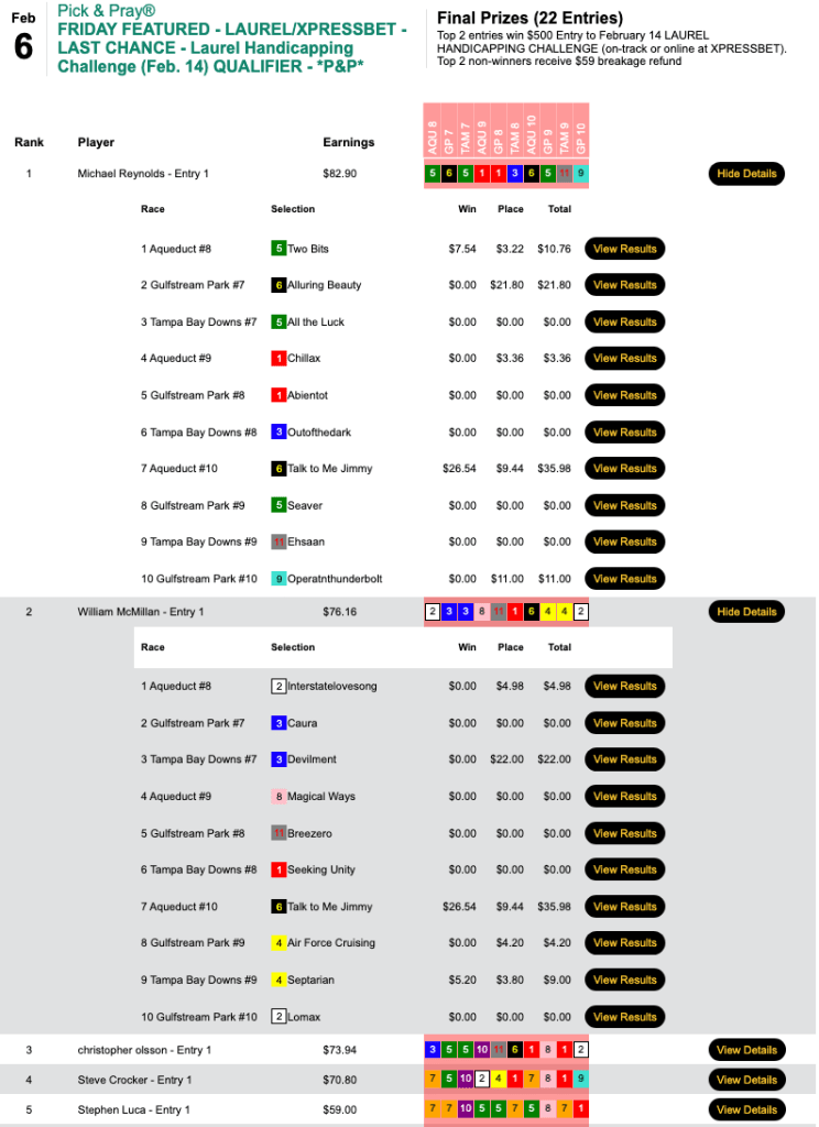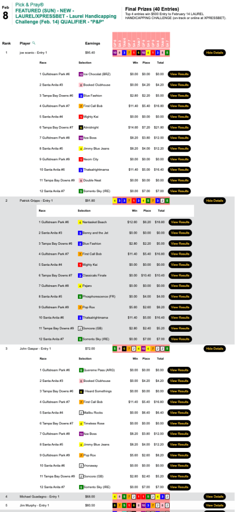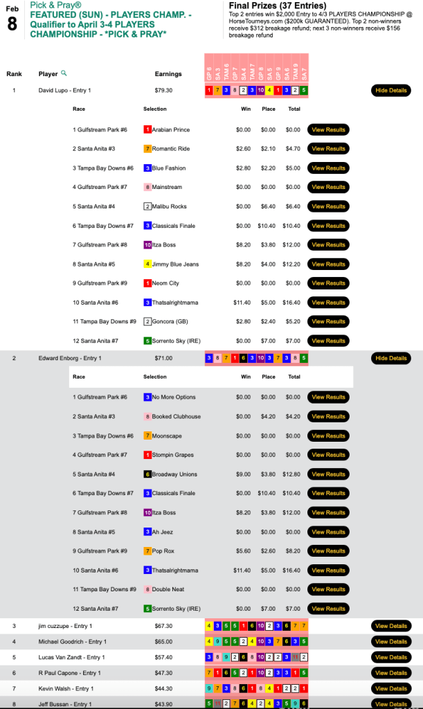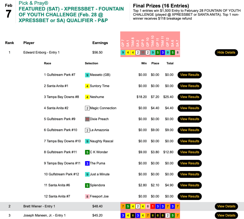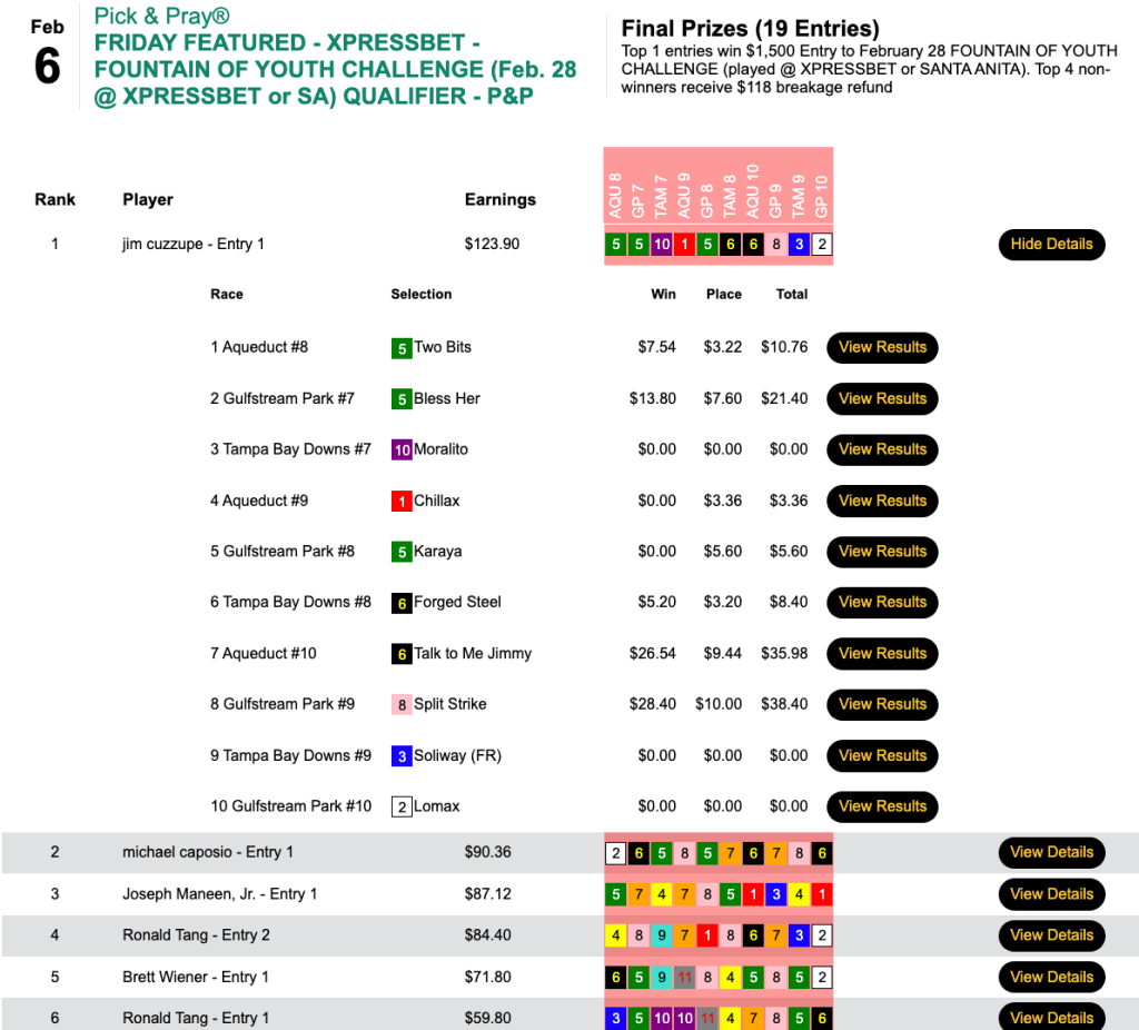 He also picked up a $1,500 entry for playing the same picks back in Friday’s Pick & Pray qualifier to the Xpressbet Fountain of Youth Challenge on February 28.