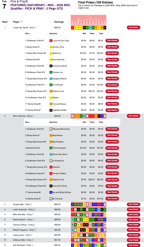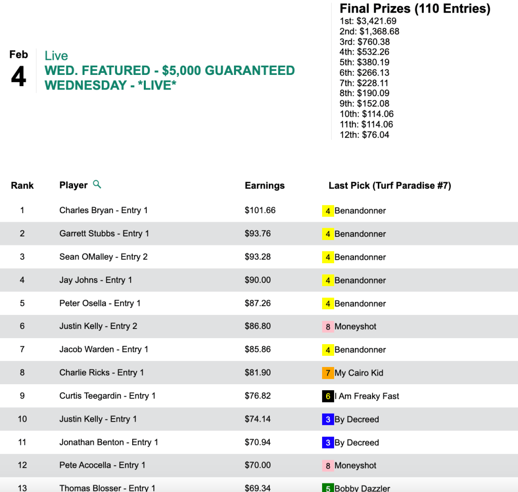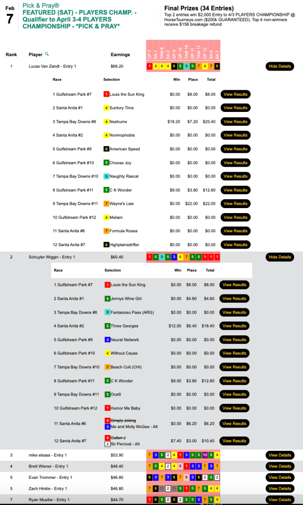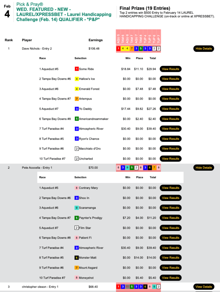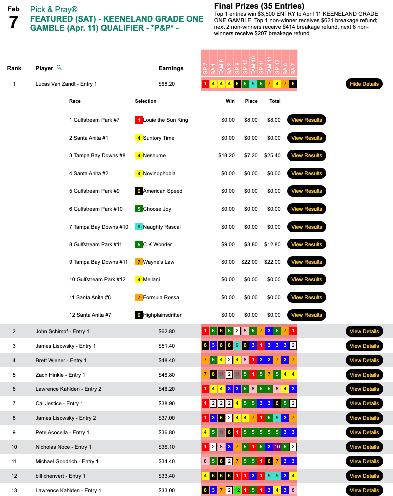 He also picked up a $1,500 entry for playing the same picks back in Friday’s Pick & Pray qualifier to the Xpressbet Fountain of Youth Challenge on February 28.