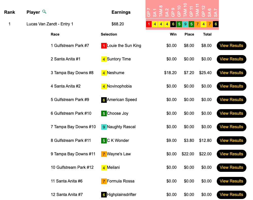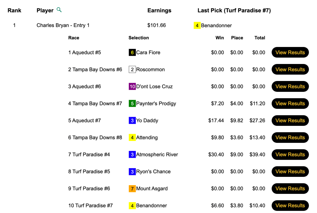 It wasn’t a terrific day for scoring. The total for Van Zandt, our 2023 Players Championship winner, was $68.20. He did have the day’s biggest price in Neshume ($18.20, $7.20), who took the 8th at Tampa, but he was not the day’s top scorer. Nevertheless, the day turned into a potential “year-maker” for him.