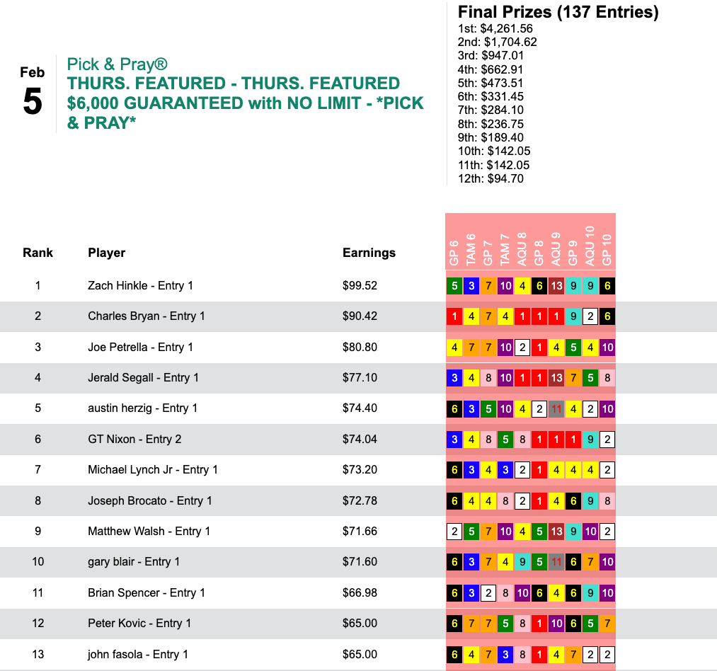 Hinkle (4 firsts, 2 seconds) got the up-top money of $4,261 in Thursday’s $6,000 Gtd. Pick & Pray, which was ultimately worth a total of $9,470.