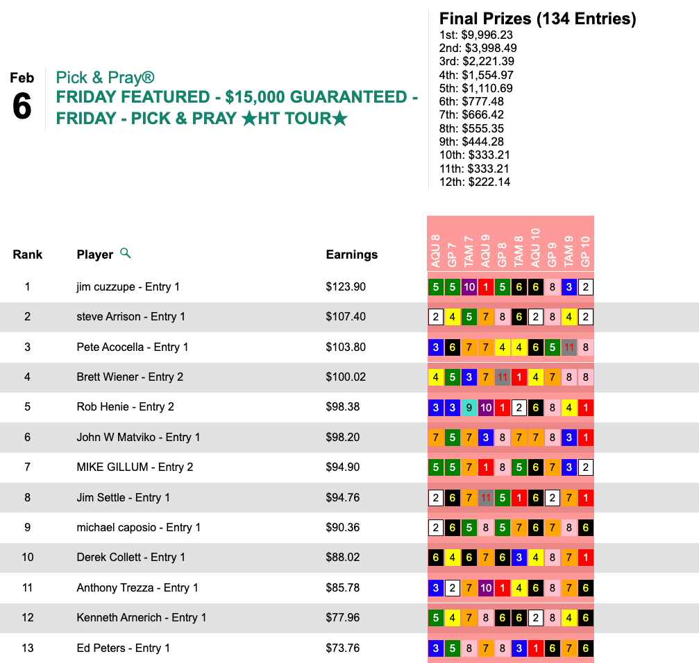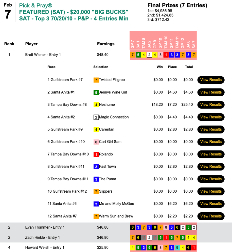 One of them was our 47,124 Big Bucks Pick & Pray. Brett Wiener got the top spot—and the $4,986 that went with it—in that one. Neshume was Wiener’s only winner of the day, but he supplemented that lone victor with six (count ‘em, six!) place collections.
