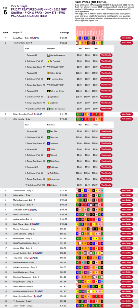 In Friday’s $75 NHC qualifier at HorsePlayers, the first- and third-place finishers were Louis Masry and Dylan Donnelly, respectively. That pair, however, was already double-qualified and, thus, playing strictly for NHC Tour points.