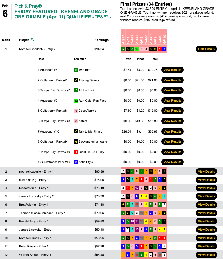 Goodrich (3 winners and 2 double-digit place collections) secured himself a $3,500 place in the April 11 Keeneland Grade One Gamble.