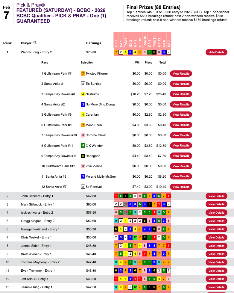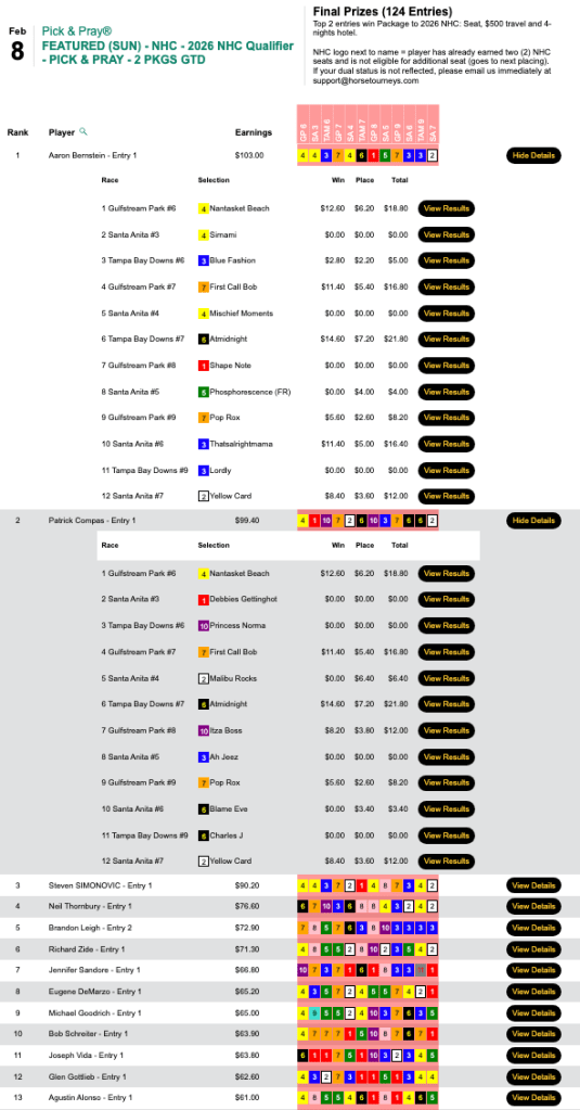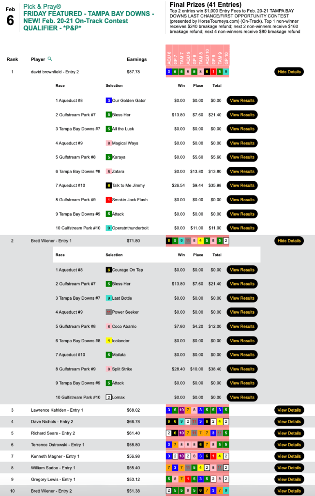 David Brownfield (2 wins, 3 places) and NHC Hall of Famer Brett Wiener (3W, 0P) snagged the $1,000 seats in Friday’s qualifier to the High Rollers Handicapping Contest at Tampa Bay Downs on February 20-21.