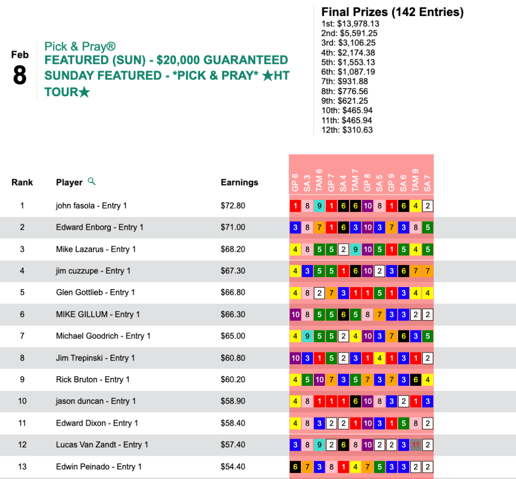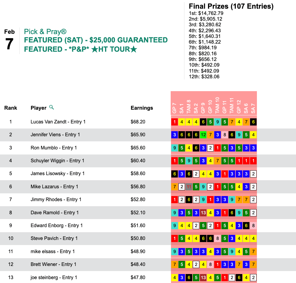 The Nutmeg State resident bagged $14,762 for capturing our richest tourney of the week, Saturday’s $25,000 Gtd. Pick & Pray (an HT Tour battle), which closed with a final overall purse of $32,806.