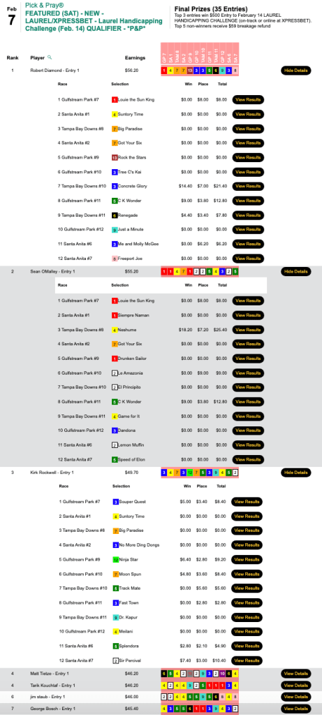 Robert Diamond (3 wins, 2 places), Sean O’Malley (2W, 2P) and Kirk Rockwell (5W, 2P) all got $500 seats for running one-two-three in Saturday’s Laurel “Last Chance-First Chance” qualifier. Diamond supported Concrete Glory. O’Malley backed Neshume. The top winner for Rockwell, meanwhile, paid $7.40, and it came in the final contest race.