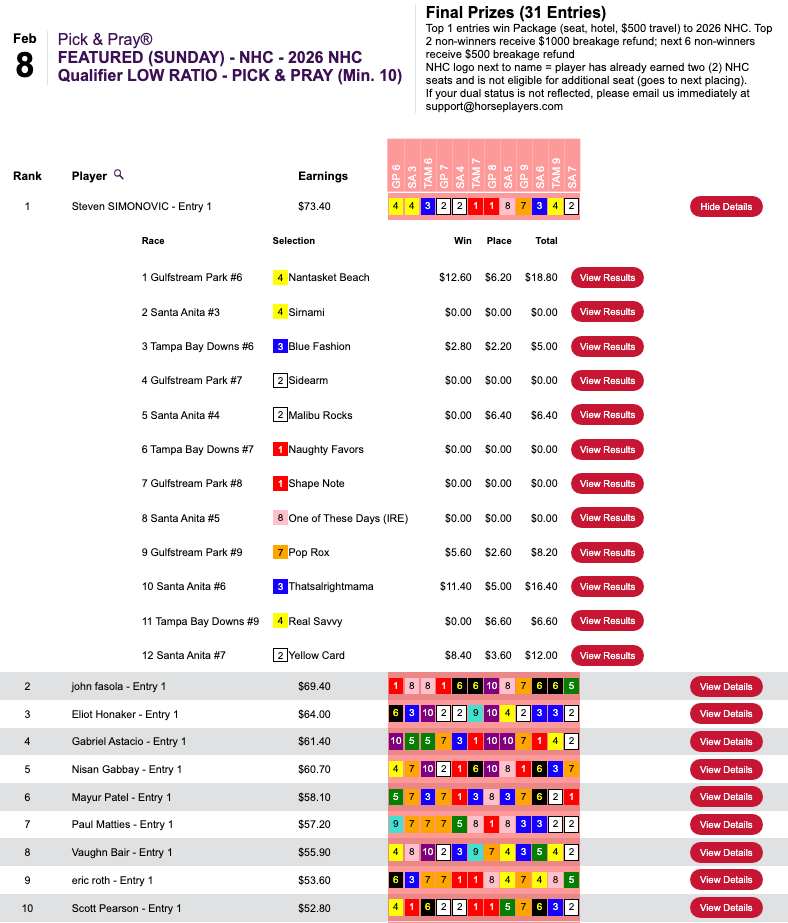 Thatsalrightmama helped make Steven Simonovic the king of Sunday’s NHC Low Ratio qualifier at HorsePlayers.