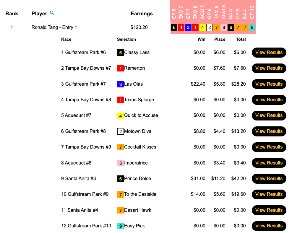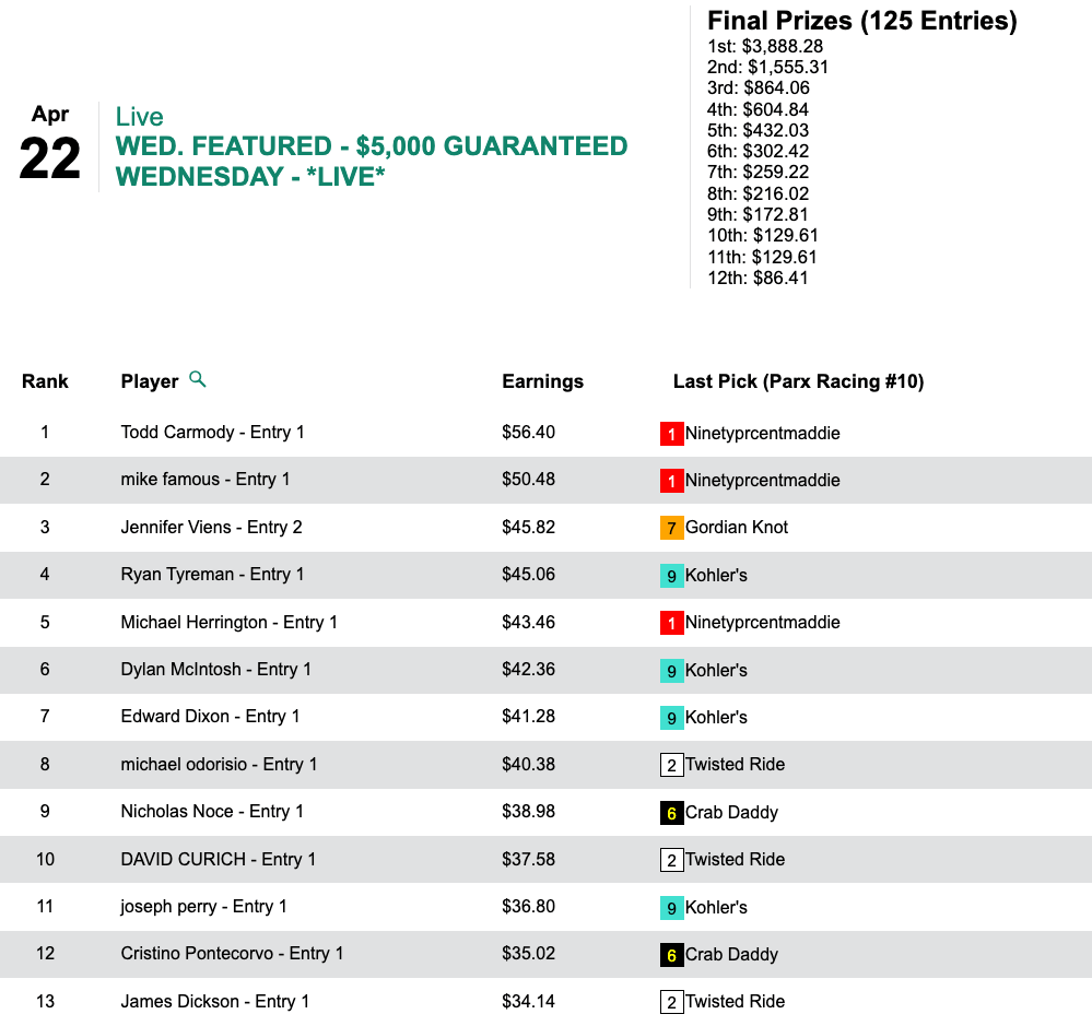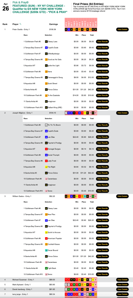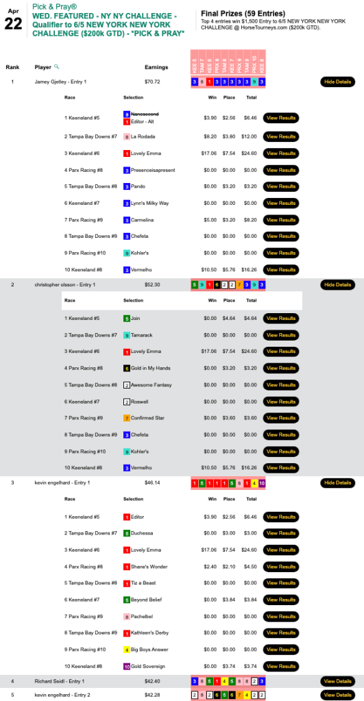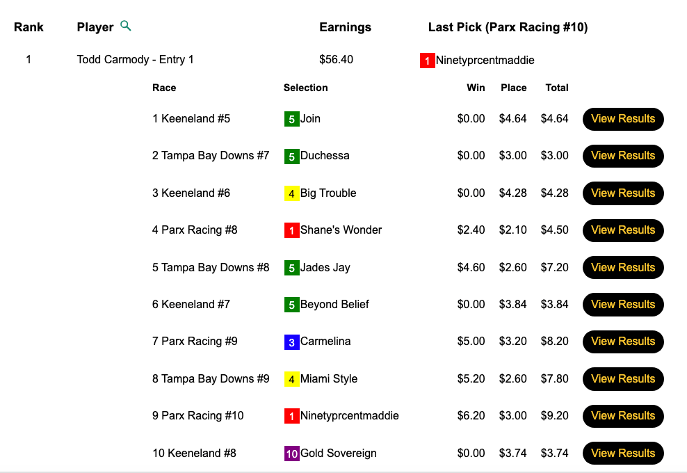 Hang on. We’re now being told that while Carmody overlooked Lovely Emma and Vermelho, he didn’t overlook much else. Carmody made collections (5 wins, 5 places) in all 10 contest races, and that got him the up-top money of $3,888 in Friday’s $5,000 Guaranteed cash tourney, which closed with a final purse of $8,640. Carmody’s noteworthy performance is a reminder that there is almost always more than one way to skin a cat here at HorseTourneys.