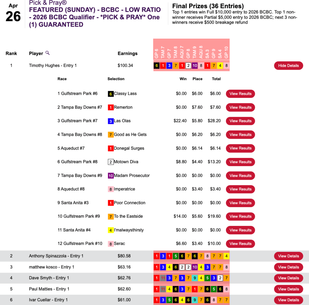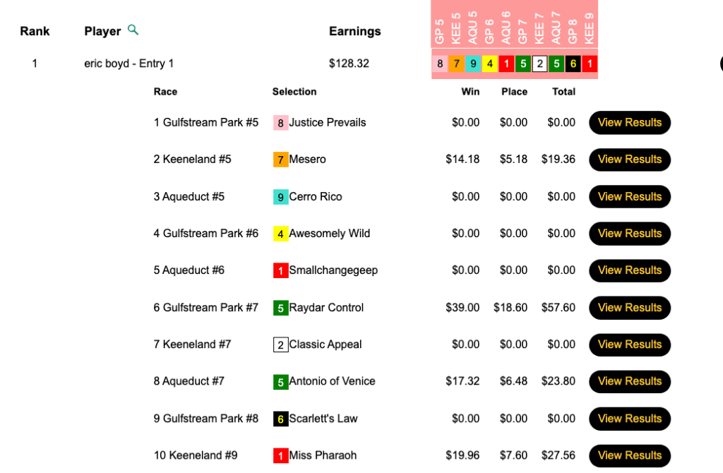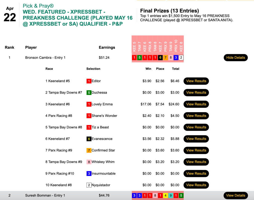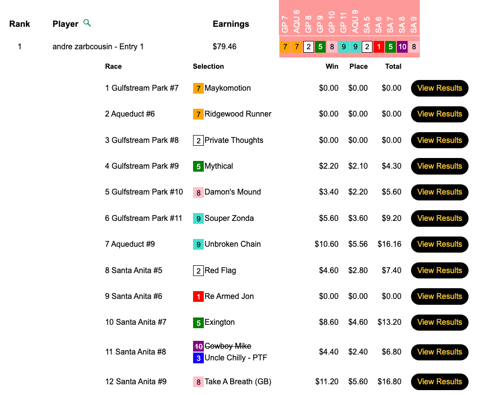 Hang on. We’re now being told that while Carmody overlooked Lovely Emma and Vermelho, he didn’t overlook much else. Carmody made collections (5 wins, 5 places) in all 10 contest races, and that got him the up-top money of $3,888 in Friday’s $5,000 Guaranteed cash tourney, which closed with a final purse of $8,640. Carmody’s noteworthy performance is a reminder that there is almost always more than one way to skin a cat here at HorseTourneys.