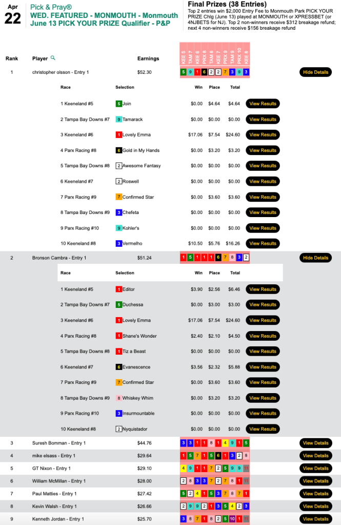Meanwhile, Christopher Olsson copied and pasted his New York New York Challenge picks into his Monmouth Pick Your Prize qualifier entry.