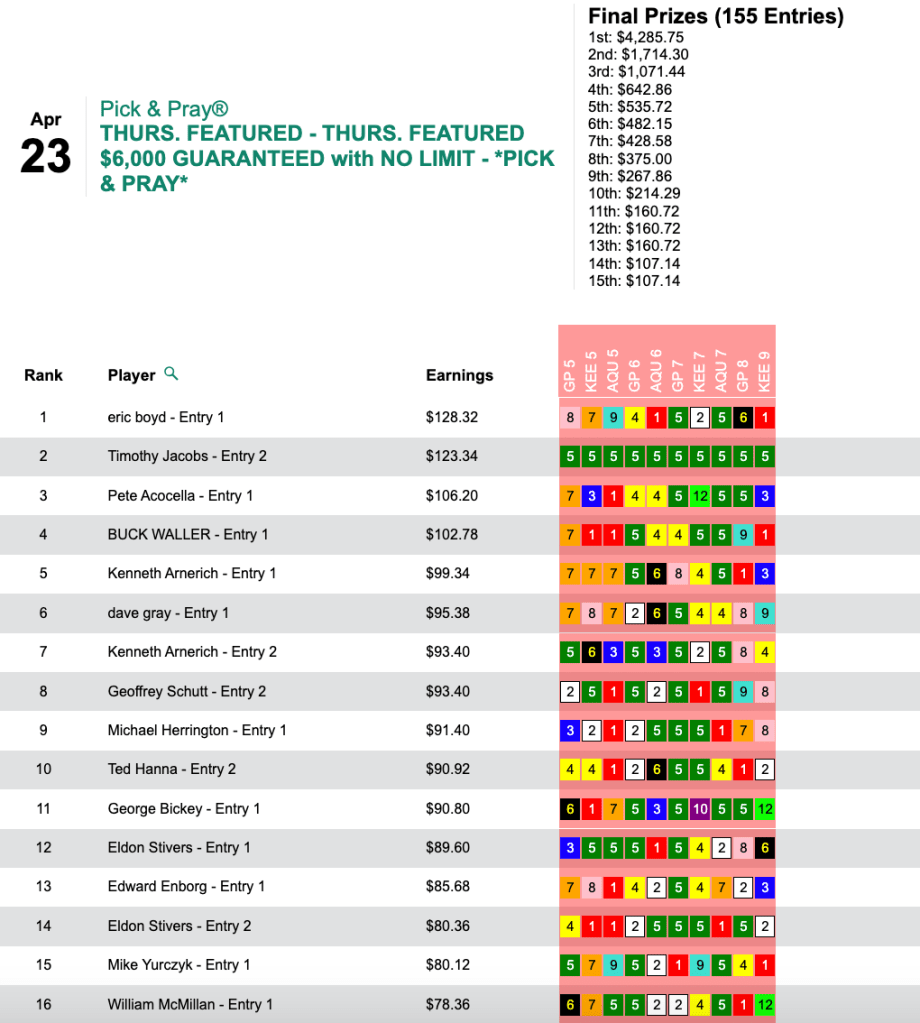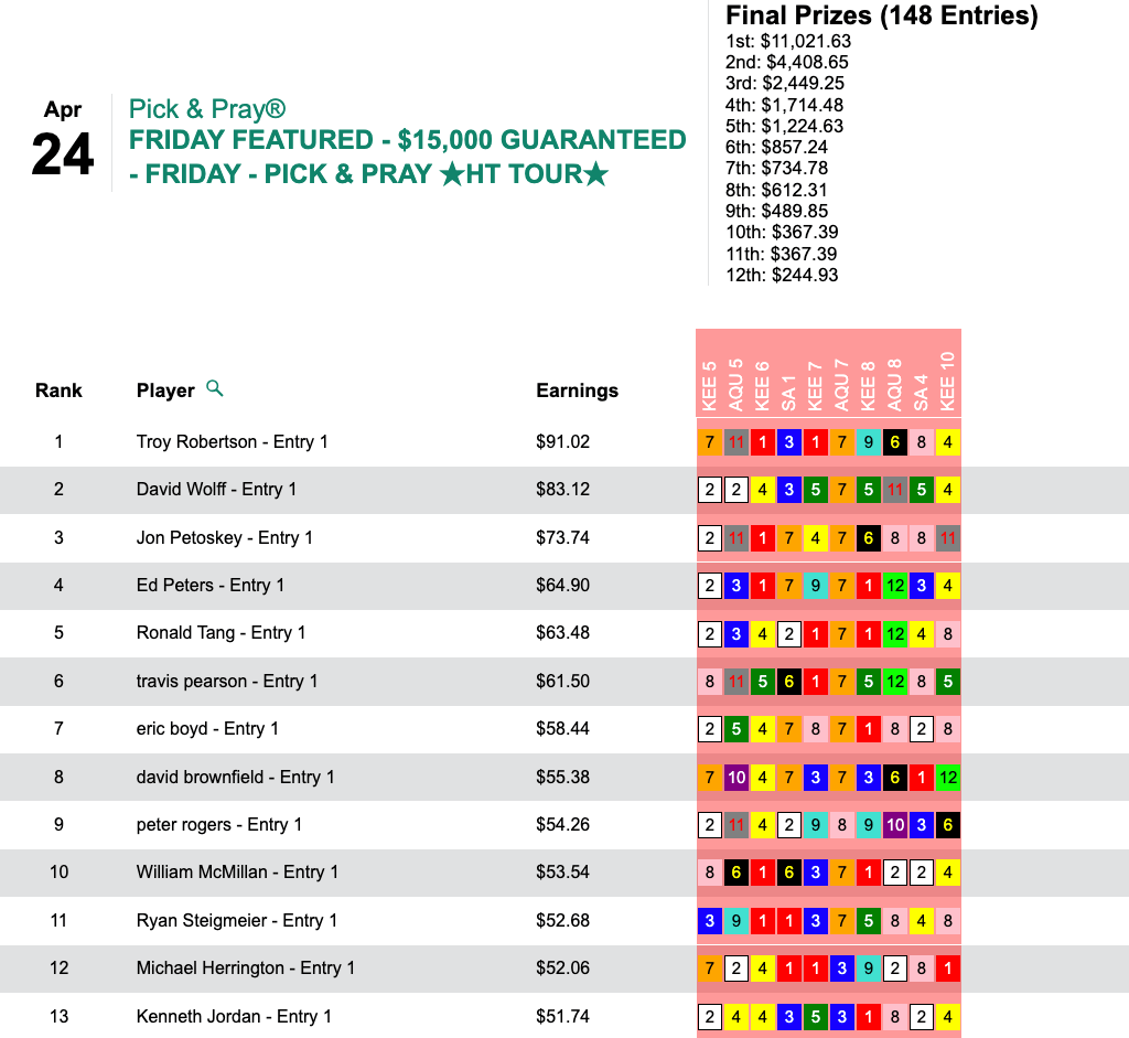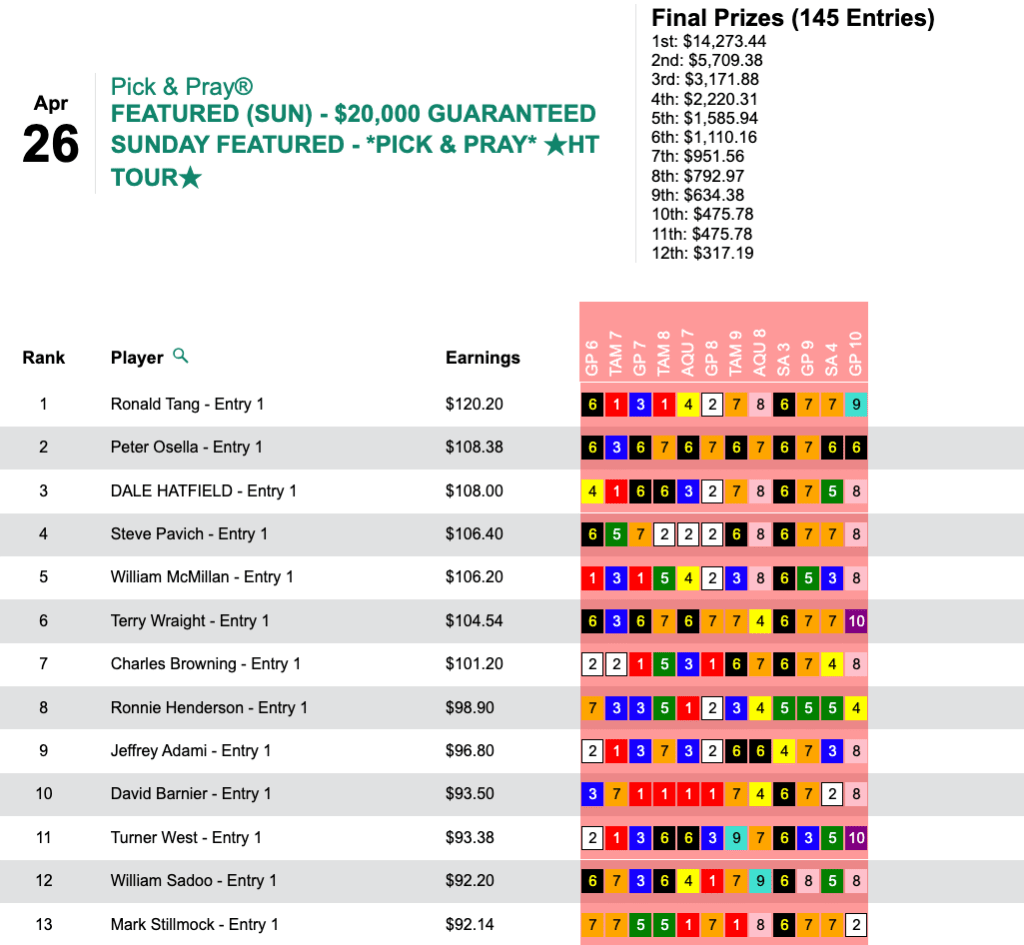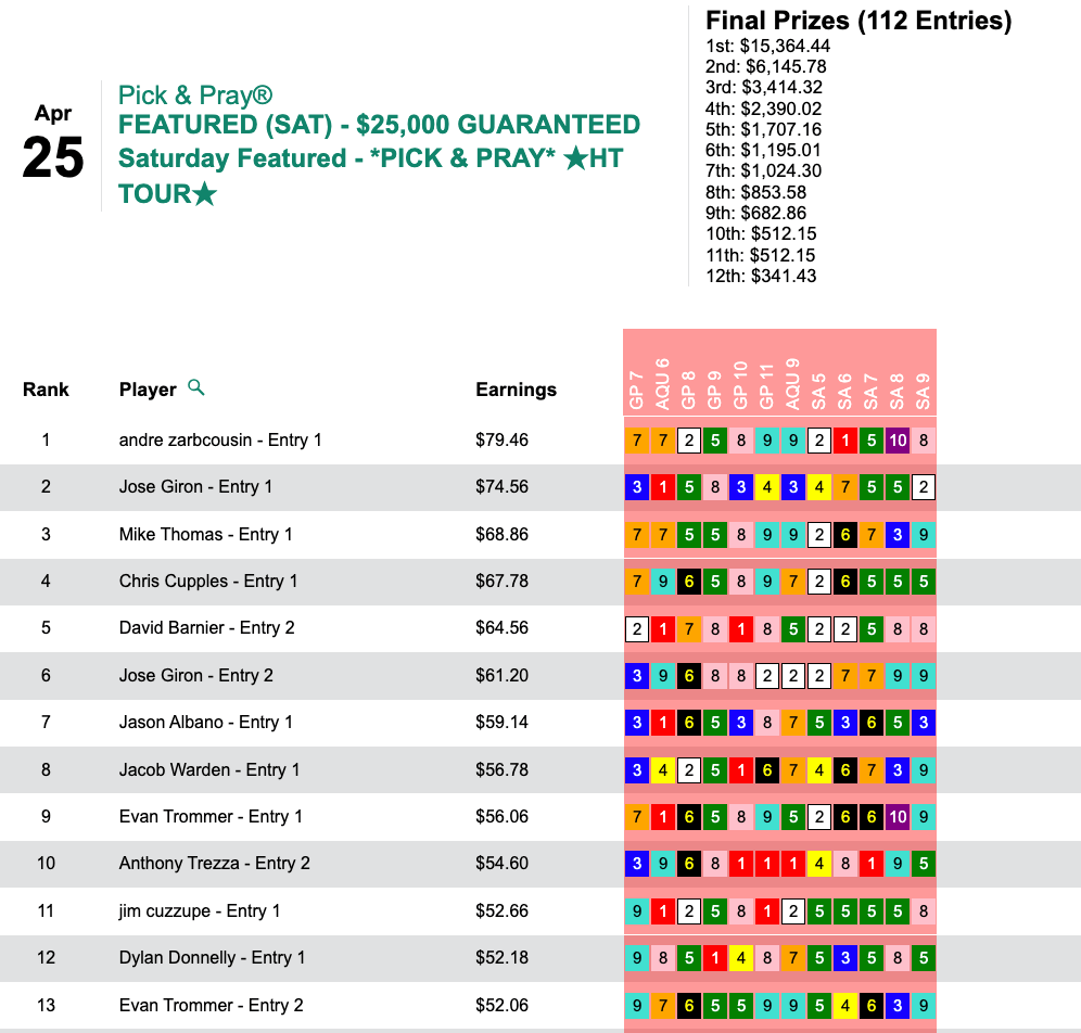 Our richest game of the week was Saturday’s $25,000 Gtd. Pick & Pray. This HT Tour event closed with a final prize pool of $34,143.