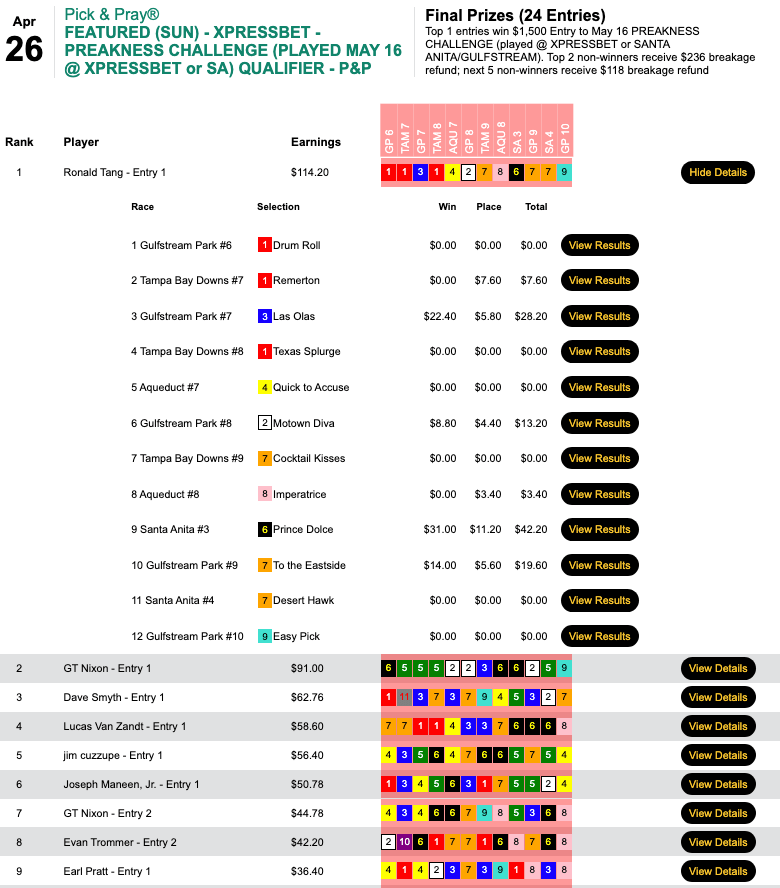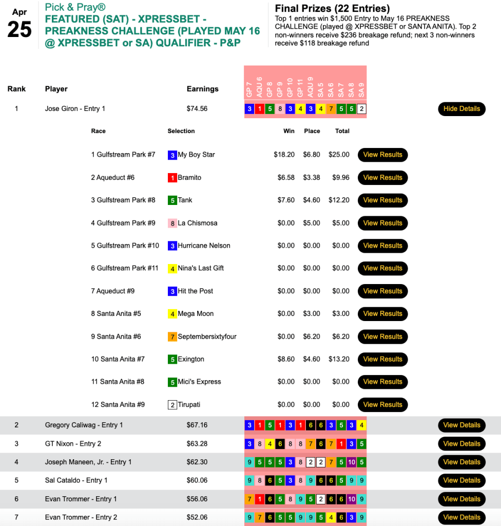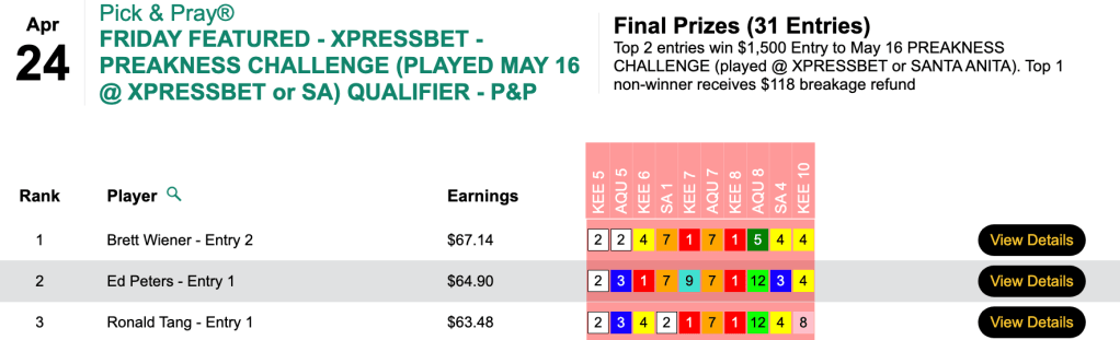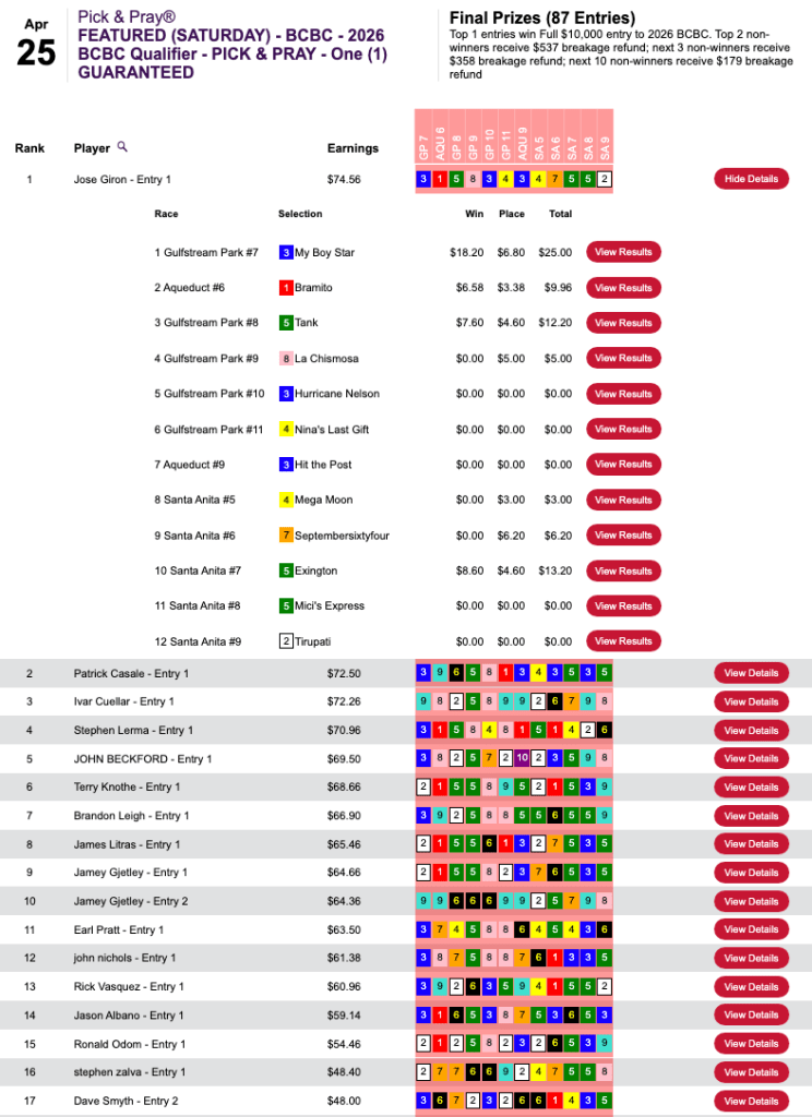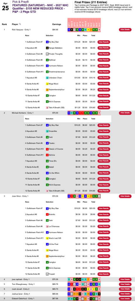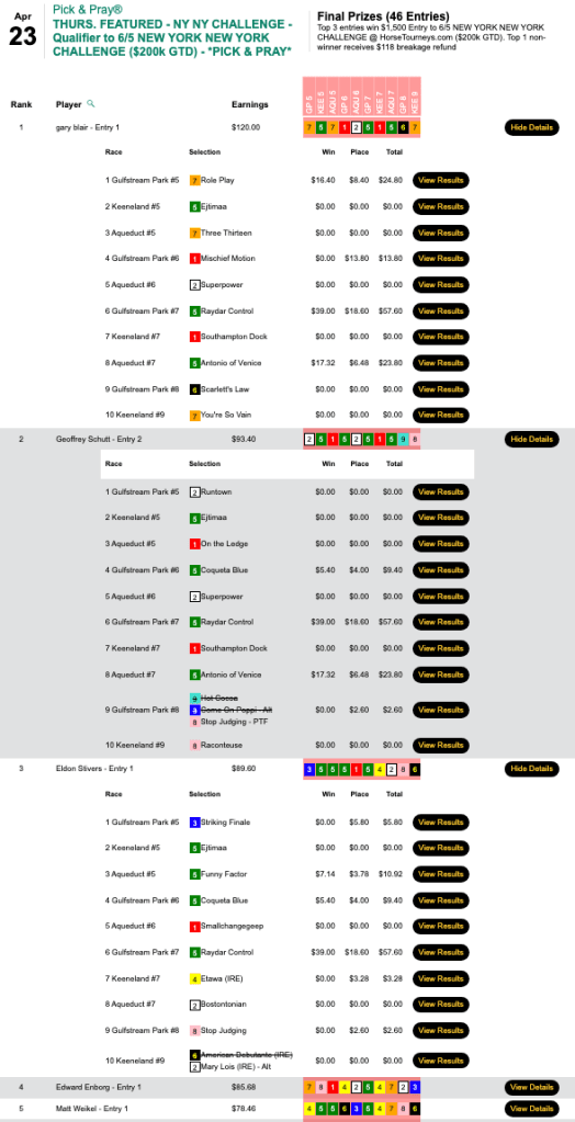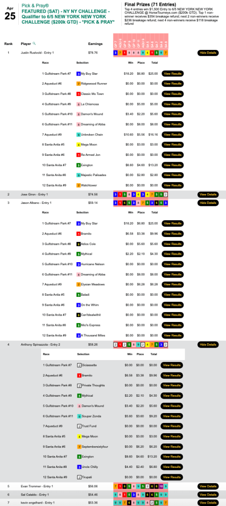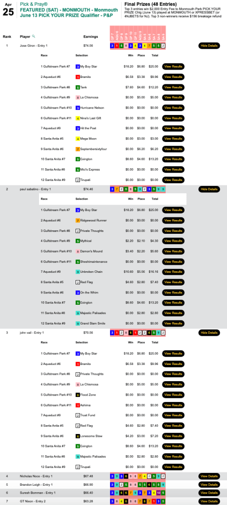 Thanks to a 4-win, 3-place performance that included the day’s biggest price—My Boy Star ($18.20, $6.80) in the first contest race, the 7th at Gulfstream–Giron won himself a second entry to all three of the aforementioned tournaments. Giron finished behind fellow My Boy Star fan Justin Rustvold (4 wins, 0 places) and ahead of Jason Albano (3W, 3P) and 2023 Spa & Surf Showdown victor Anthony Spinazzola in the four-seat New York New York Challenge qualifier. Giron took a backseat to no one in the Preakness Challenge and Monmouth Pick Your Prize play-ins. That Monmouth qualifier also saw the other two players to reach the $70.00 mark get a $2,000 berth for June 13. Congrats to My Boy Star backers Paul Sabatino (6 wins, 1 place) and John Vail (5W, 2P).