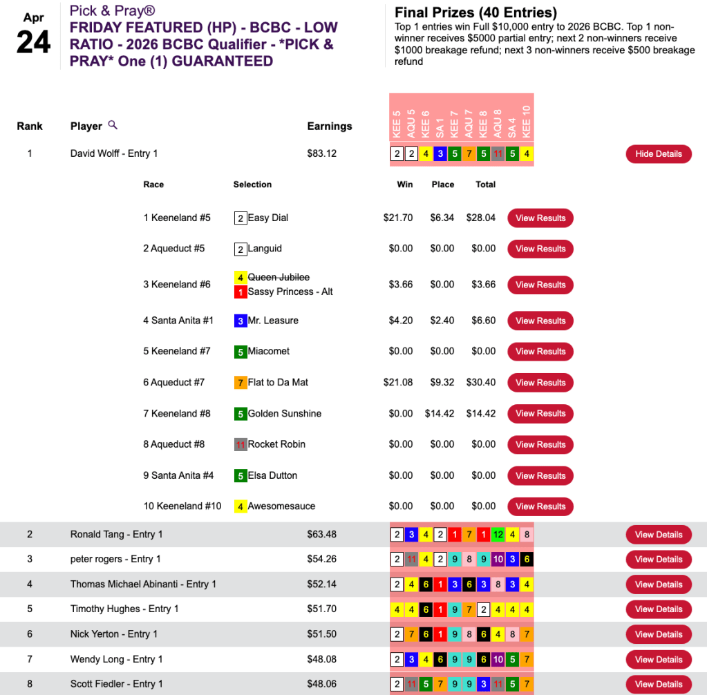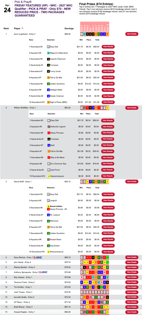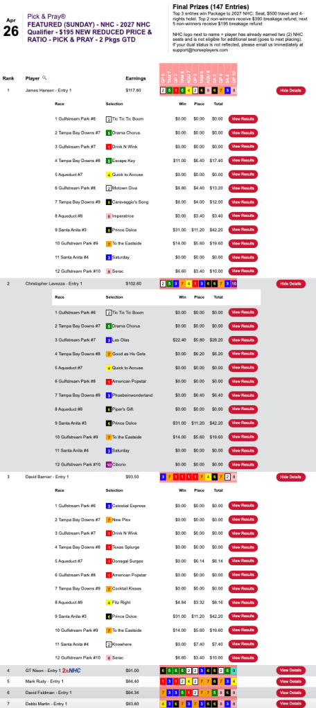 Congrats to Prince Dolce choosers James Hansen (5 wins, 1 place), Chris “Army Strong” Lavezza (3W, 2P) and David Barnier (3W, 2P). Barnier just had a measly $6.14 place collection to show for his first seven selections, but he generated 4 wins and a place from the final five races, and now he’s headed to Vegas.