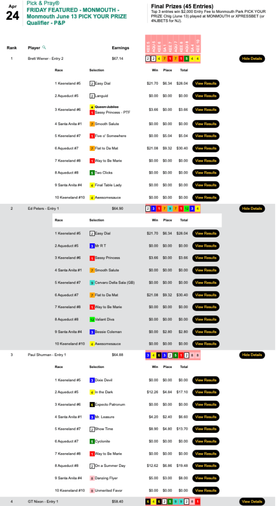 Utilizing the same selections, Wiener and Peters also made up the “exacta” in Friday’s Monmouth Pick Your Prize qualifier.