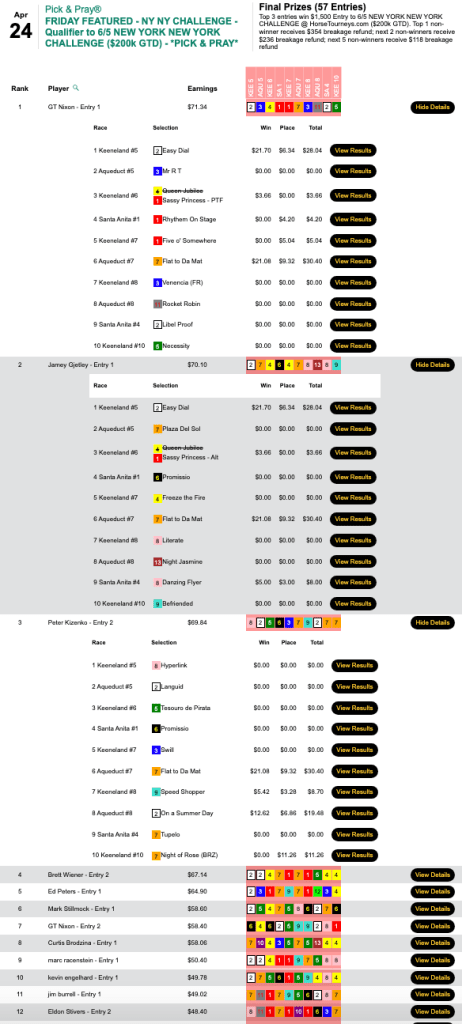 Forty-eight hours after finishing first in Wednesday’s “NYNYC” play-in, Gjetley (4 wins, 0 places) came home second in Friday’s three-seater. He and fellow Flat to Da Mat supporters G.T. Nixon (3W, 2P) and Peter Kizenko (3W, 1P) also came away with $1,500 seats. Kizenko, it may be interesting to note, did all of his scoring over the final five races of the 10-race contest.