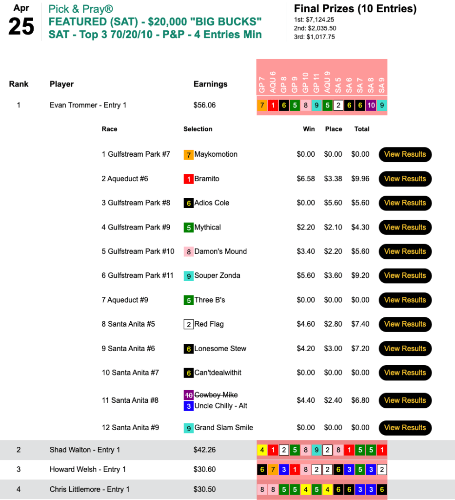 Evan Trommer put up 7 wins and a place to take down the $7,124 first prize. Slow and steady won the race for Trommer. His highest single return came from Bramito ($6.58, $3.38) in race 6 at Aqueduct.
