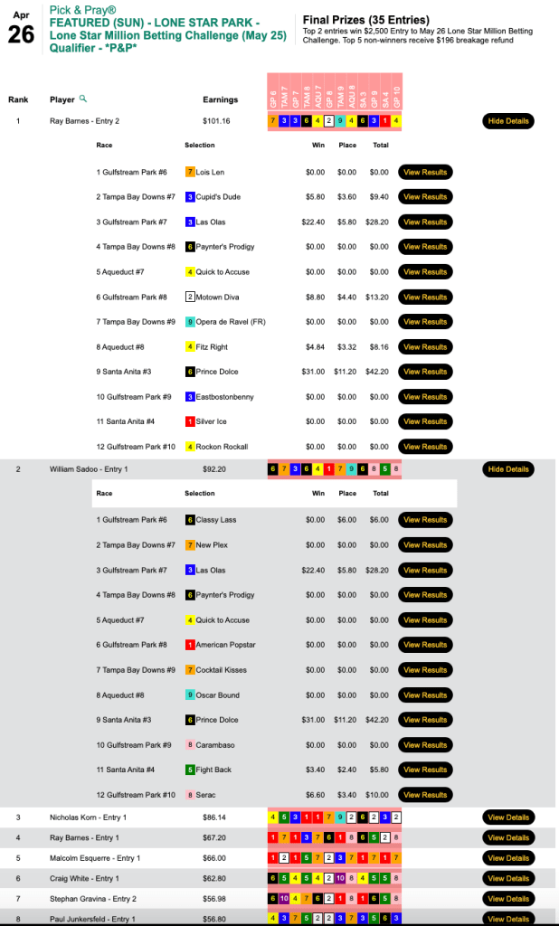 Ray Barnes (5 wins, 0 places) and William “23” Sadoo (4W, 0P) were the $2,500 entry winners when the shootin’ in this Texas shootout died down. They each came up with both Las Olas and Prince Dolce.