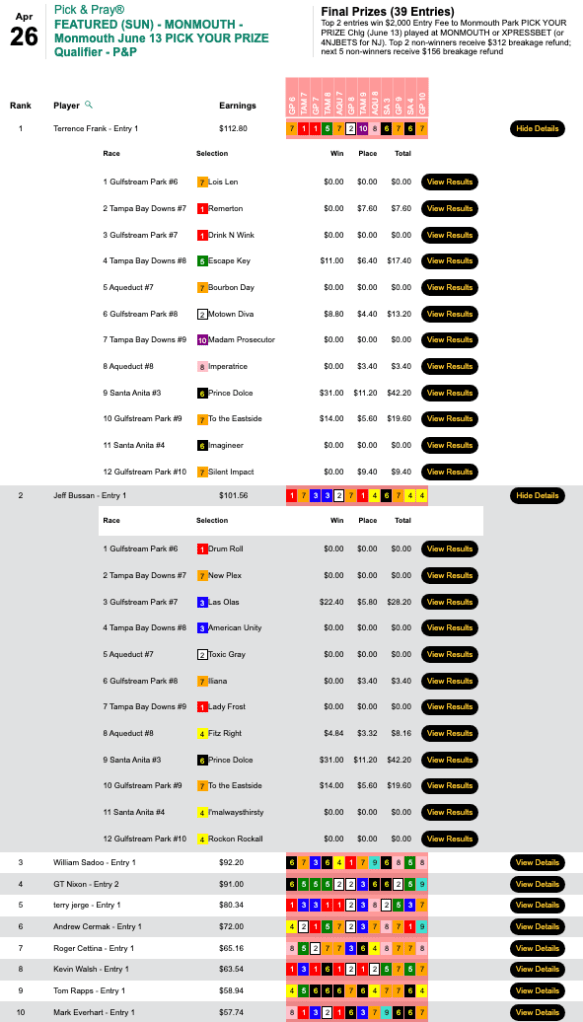 Frank (4 wins, 3 places) and Bussan (4W, 1P) were the only two players in Sunday’s Monmouth Pick Your Prize qualifier to crack the century mark, and they garnered the two available $2,000 entries.