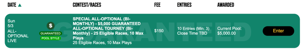 It’s a $5,000 Guaranteed “All Optional Live” cash tourney that we’ll be running a couple of times per month. The format is similar to the one that was used in the recently concluded Players Championship. You will be given 25 races to choose from, and, from those, you make 10 plays. It certainly adds an element of strategy to the proceedings. Hope to see you there.